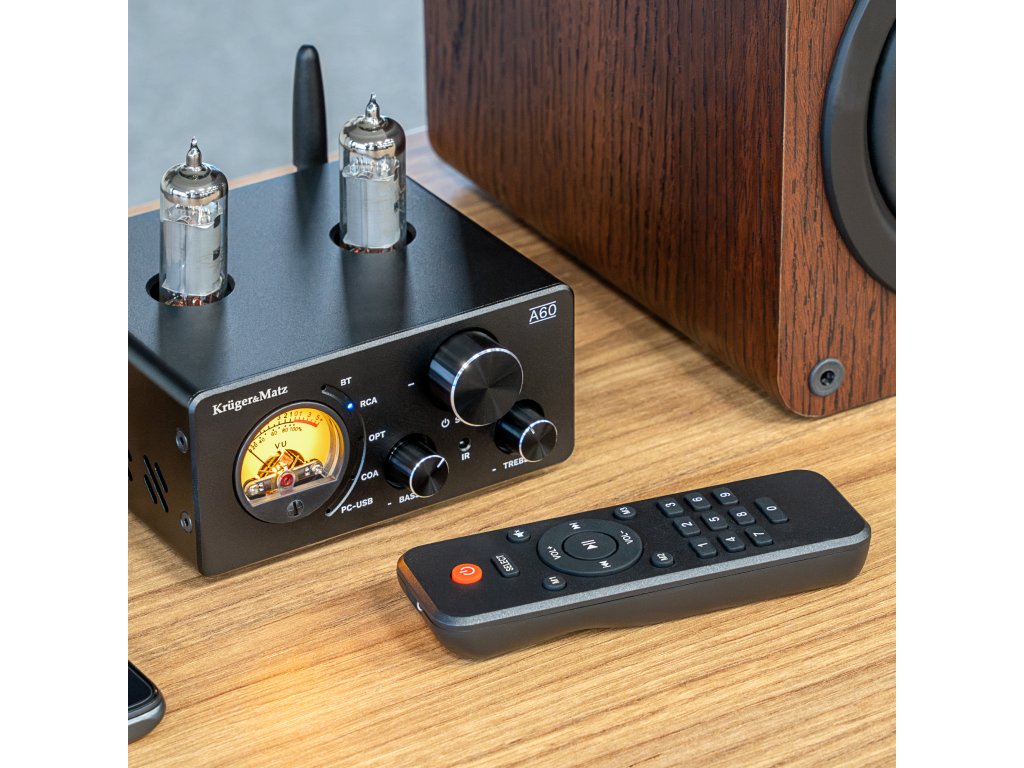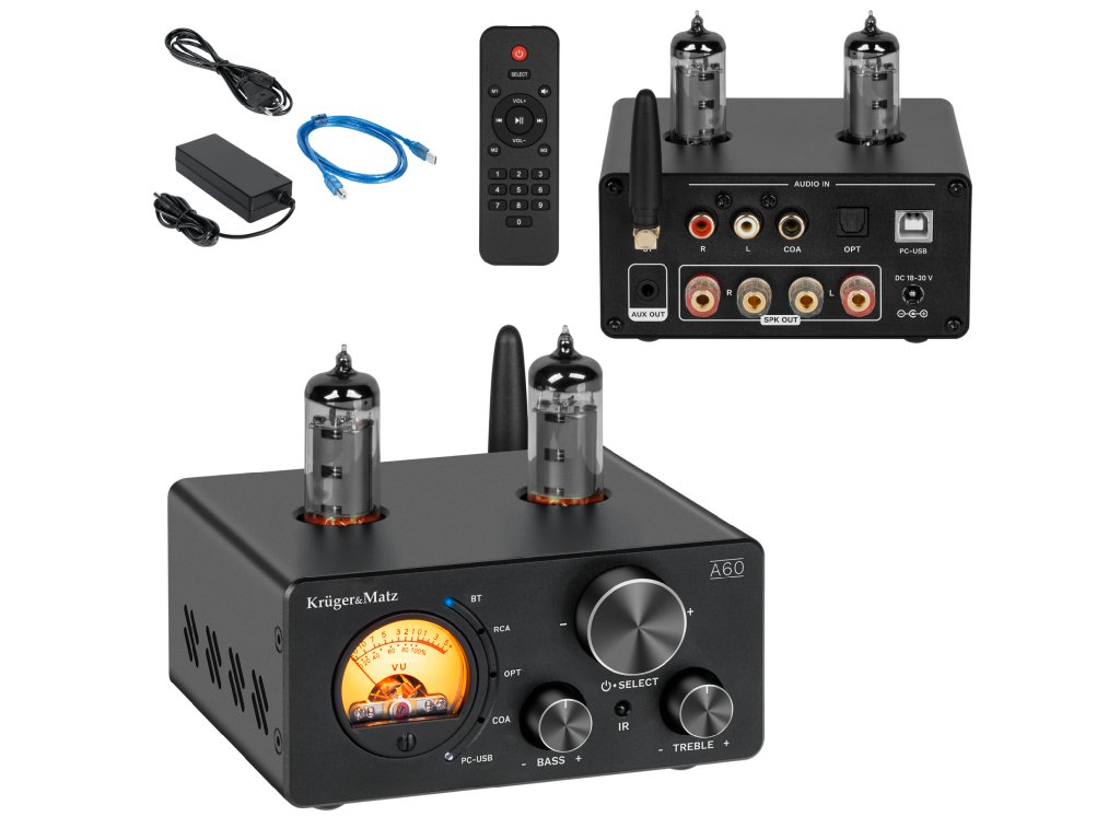 Amplificatorul stereo Kruger&Matz, care funcționează cu o putere de 2x100, se remarcă prin utilizarea tuburilor 6K4, care creează un sunet cald și natural cu adâncime și claritate mari.