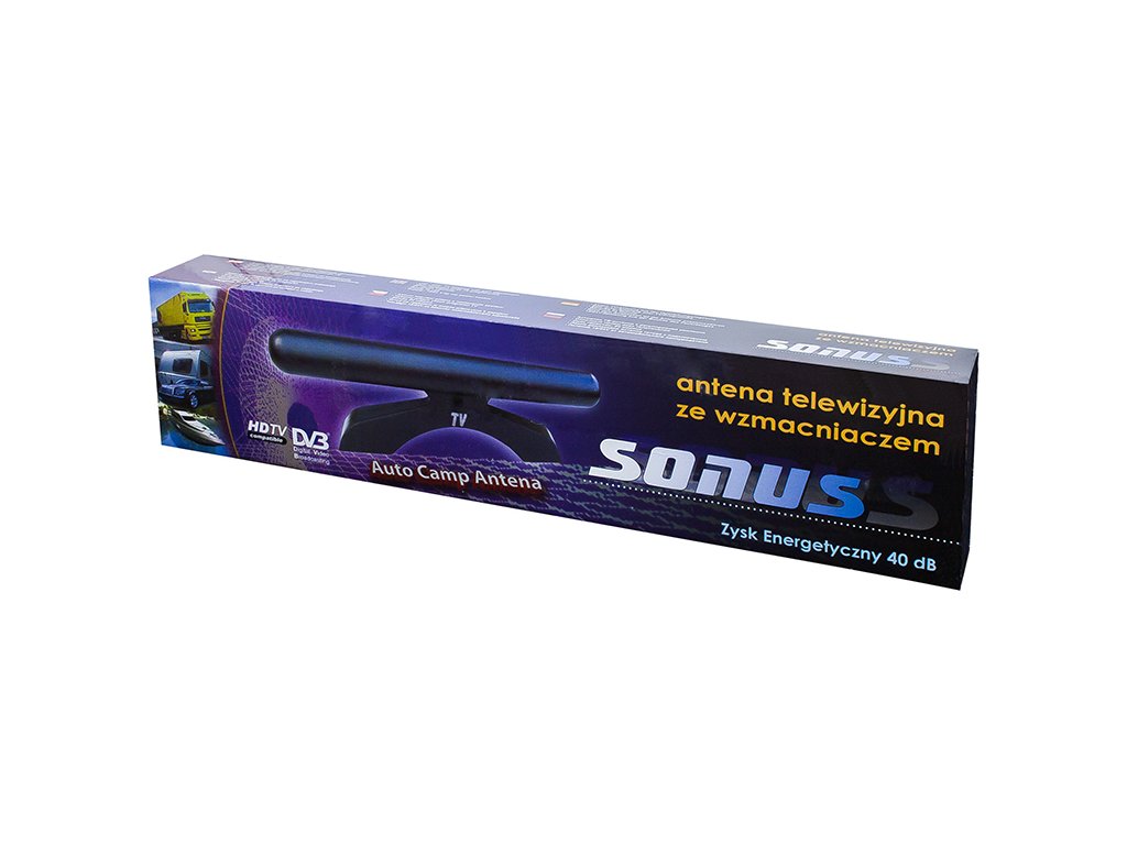 Antena TV SONUS este destinată recepționării semnalelor în cea de-a treia (canalele 6 până la 12), a patra și a cincea gamă (canalele 21 până la 69) a benzii TV. Este potrivită pentru utilizare în interior (apartament, camping, mașină...) Antena este echipată cu un amplificator pentru recepționarea semnalului, având un buton pentru reglarea continuă a câștigului. Utilizarea amplificatorului permite recepționarea semnalelor TV relativ slabe, astfel încât poate fi folosită de destinatarii care locuiesc la o distanță considerabilă de stația emitentă. Pentru transmiterea semnalului de la antenă la televizor se folosește un cablu coaxial de 75 Ohm, care este conectat la o priză ce permite alimentarea din priza brichetei auto.Caracteristici: