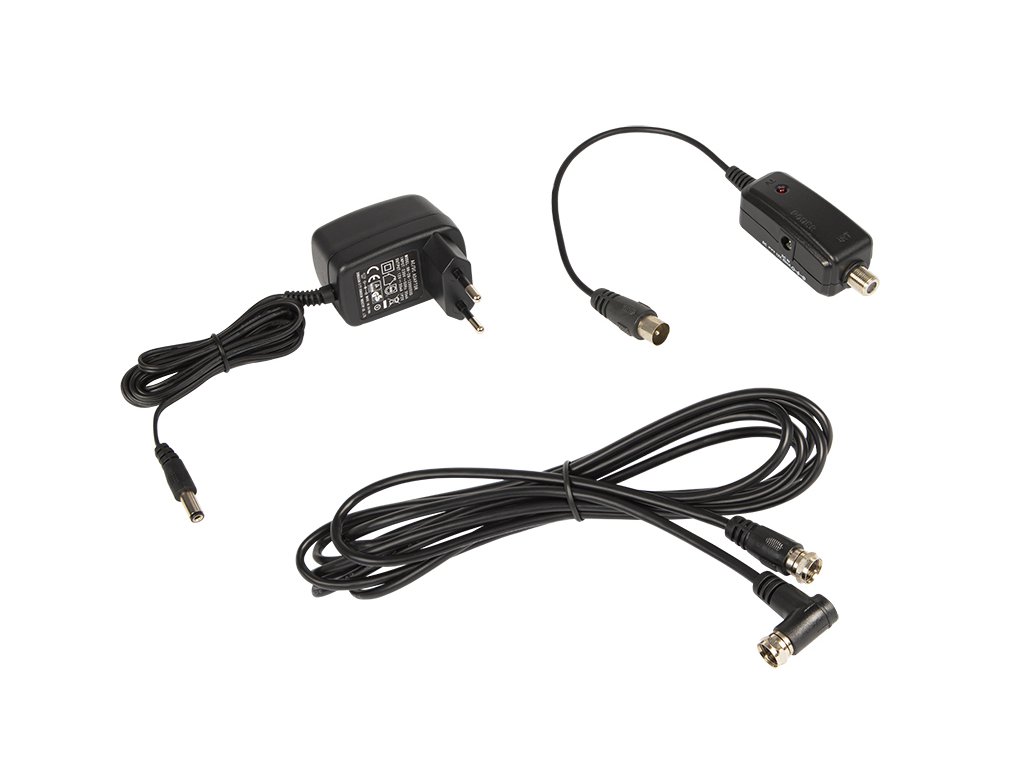 - Unitatea principală a antenei- Suport- Șurub de montare- Cablu coaxial F-F lungime: cca 3 m- Adaptor de rețea- Adaptor cu amplificator- Manual de utilizareAmbalajul pentru consumatori conține: