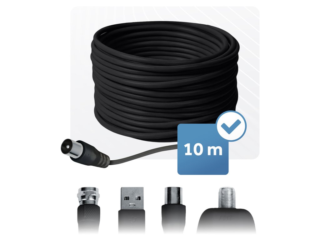 Antena noastră de interior este echipată cu un cablu solid de 10 metri care asigură flexibilitate totală în poziționare – o vei potrivi perfect acolo unde semnalul este cel mai puternic, indiferent de amplasarea televizorului.