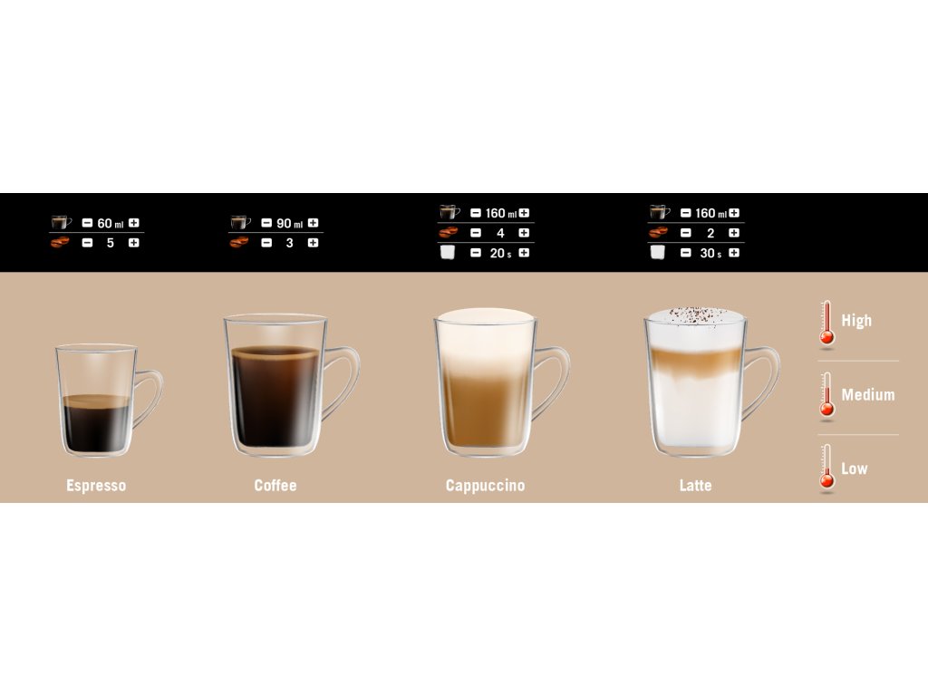 AROMA 800 vă permite să savurați gustul băuturii preferate, preparată conform preferințelor personale. În meniul espressorului puteți alege cu ușurință tipul de cafea și puteți seta temperatura, intensitatea, dimensiunea și proporțiile. În plus, o puteți prepara nu doar din boabe, ci și din cafea măcinată. Pregătiți-vă cafeaua perfectă conform dorințelor dumneavoastră.