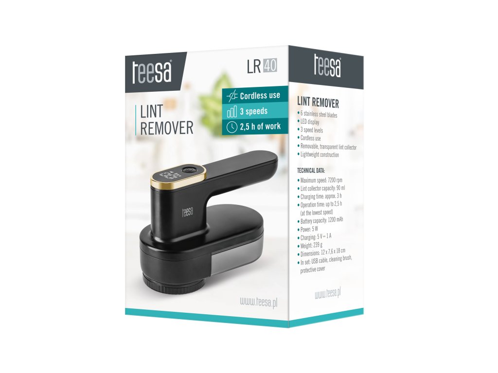 Împrospătează-ți hainele preferate și bucură-te de aspectul lor impecabil cu îndepărtătorul de scame cu acumulator Teesa LR40. 6 lame din oțel inoxidabil utilizate în acesta îndepărtează eficient și rapid toate scamele din garderoba ta. Utilizarea și igiena sunt asigurate de recipientul cu un volum de 90 ml, a cărui umplere o poți verifica și goli la momentul potrivit.