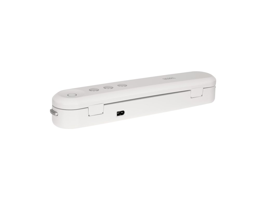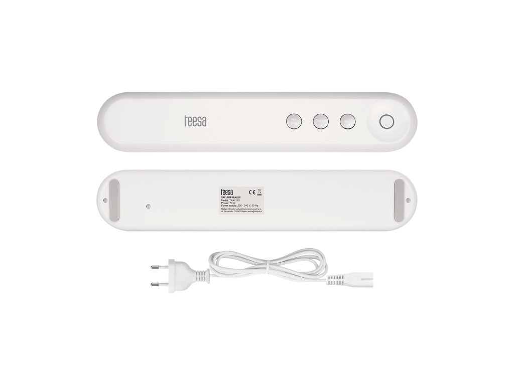 Aparatul de etanșare a alimentelor Teesa V100 este un dispozitiv care impresionează nu numai prin funcționalitate, ci și prin aspect. Datorită dimensiunilor compacte și greutății reduse, dispozitivul se va potrivi cu ușurință în orice bucătărie. Carcasa albă cu butoane iluminate albastru îi conferă un caracter modern, elegant.