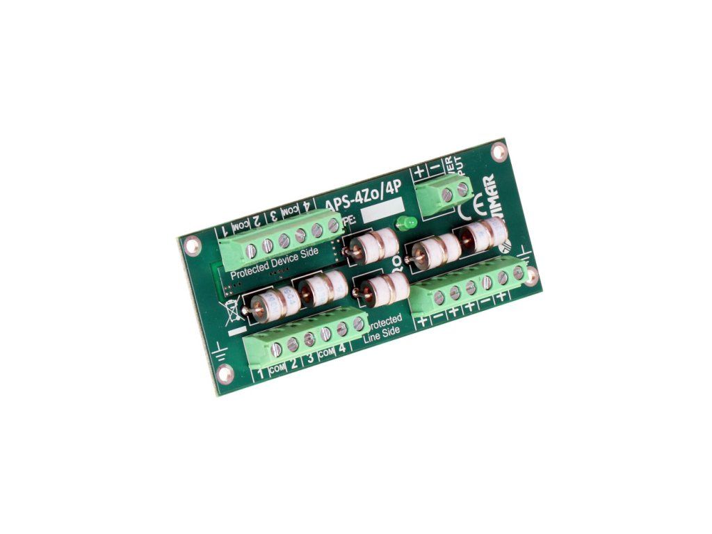 APS-4Zo/4P este o protecție împotriva supratensiunilor, ale cărei rol este de a proteja centralele sistemelor de alarmă împotriva supratensiunilor și trăsnetelor. Dispozitivul este echipat cu 4 circuite de protecție destinate semnalelor senzorilor de alarmă și 4 circuite de protecție pentru alimentare cu izolație. Protecția este destinată utilizării cu senzori instalați în exterior, unde pot apărea descărcări electrice de mare intensitate din structuri metalice, jgheaburi sau conductori. Pe lângă riscurile pentru circuitele de alarmă în sine, există și riscul de deteriorare a centralelor și a echipamentelor conectate din cauza creșterii puternice a tensiunii în firele de alimentare. Acest risc este eliminat prin împărțirea protecției circuitelor de alimentare utilizând siguranțe de supratensiune super rapide, resetabile automat MOSFET. Protecția este realizată ca un modul, instalat într-un carcasă specială împreună cu alte module care pot forma un sistem complex de protecție pentru toate semnalele centralei de alarmă.
