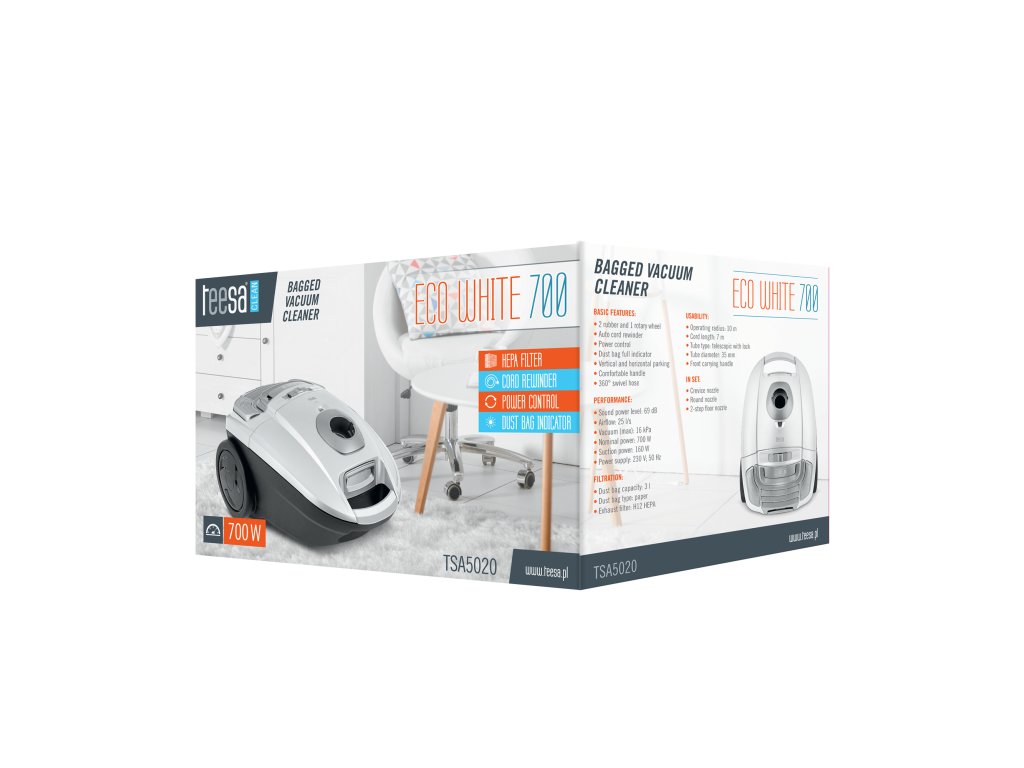 Aspiratorul ECO WHITE 700 este echipat cu trei duze - duză de crăpături, duză circulară și duză de podea cu două trepte - astfel încât puteți fi sigur că fiecare suprafață va fi curată. Ca bonus, aparatul este echipat cu un filtru HEPA H12 cu eficiență ridicată de filtrare a aerului, care absoarbe chiar și cele mai mici particule de praf din aerul aspirat.