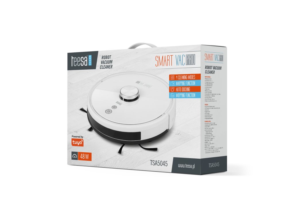 Vrei să împrospătezi rapid podelele din casa ta Nu pierde timpul, pentru asta sunt roboții de curățare! Doar atașezi cârpa, umpli rezervorul cu apă, iar robotul Teesa SMART VAC PRO, echipat cu funcția de mop, nu doar că va aspira, dar va și spăla podelele din casa ta.