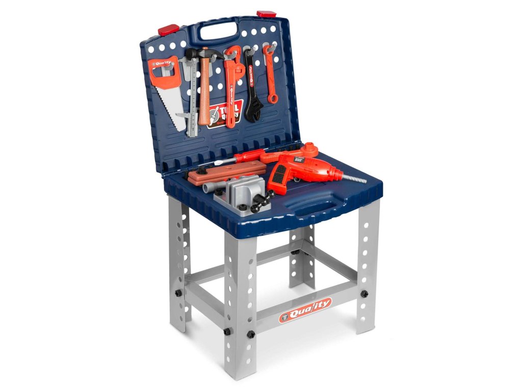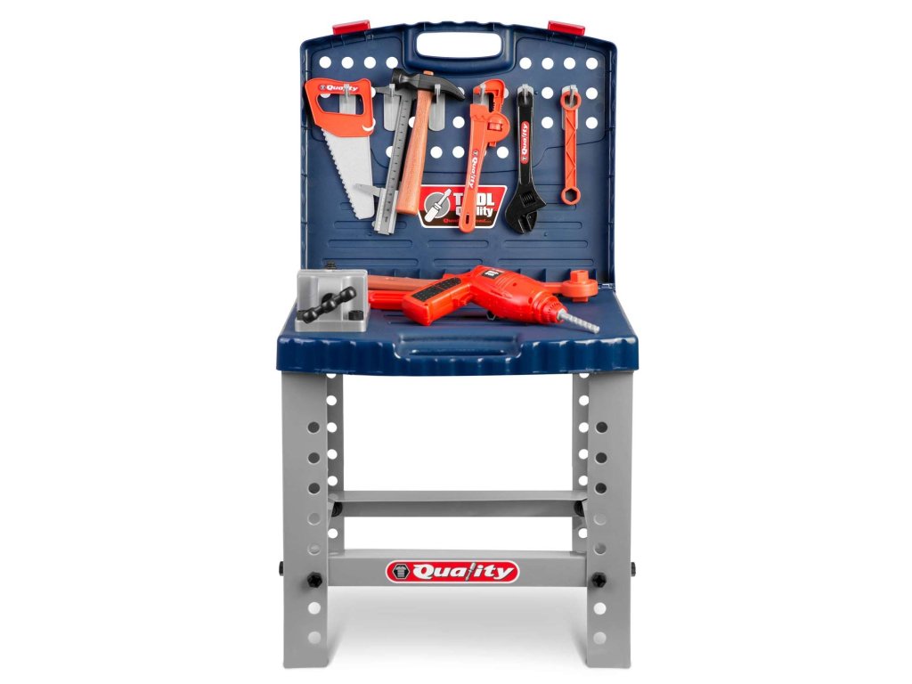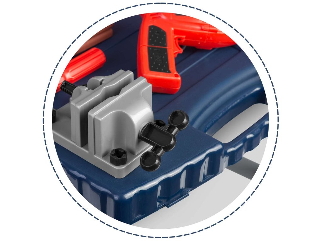 Vă prezentăm bancul de lucru pentru copii echipat cu rafturi și un set de unelte, care seamănă cu cele reale, dar din plastic ușor de curățat...