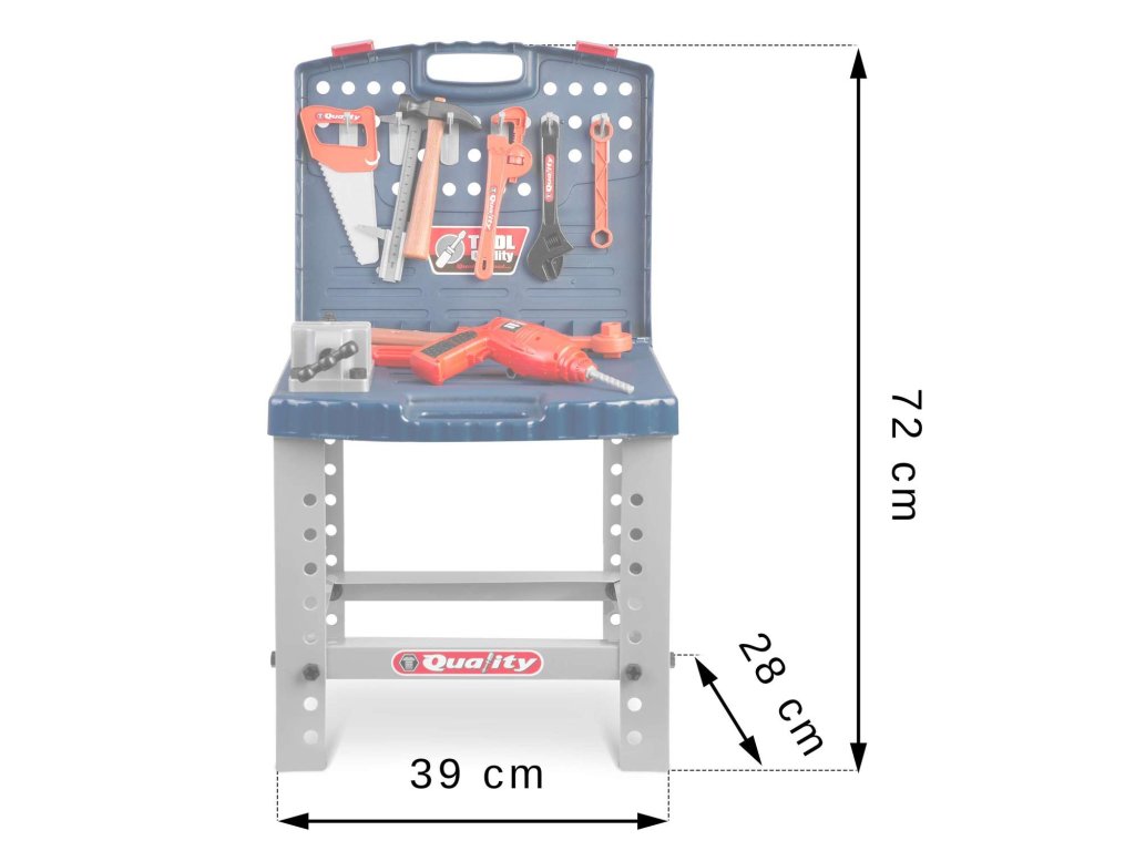 - numeroase accesorii (4 x chei, ciocan, fierăstrău, șuruburi, șurubelnițe, benzi DIY, etrier),