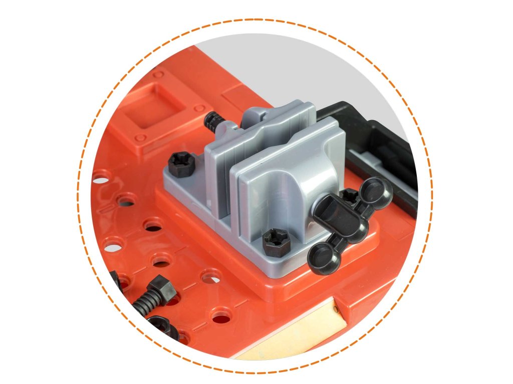 Prezentăm bancul de lucru pentru copii echipat cu rafturi și set de unelte, care seamănă cu cele reale, doar că din plastic ușor de curățat...