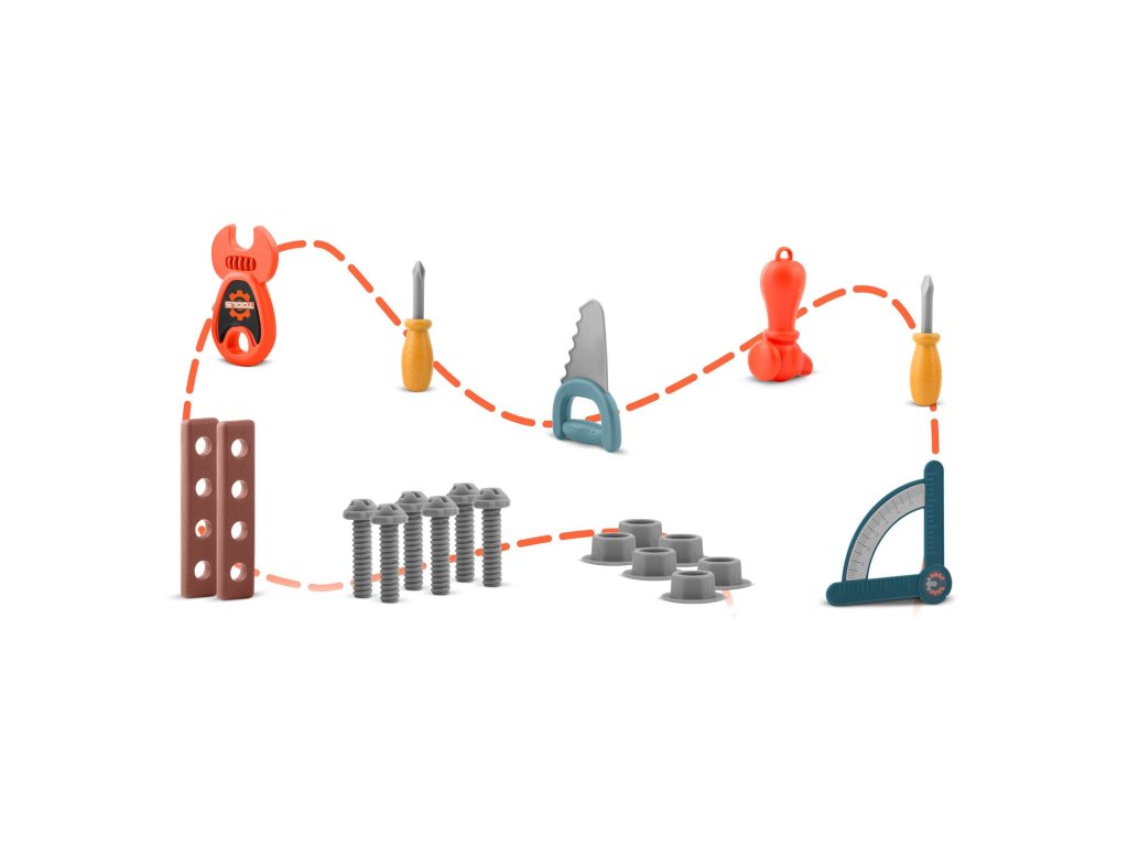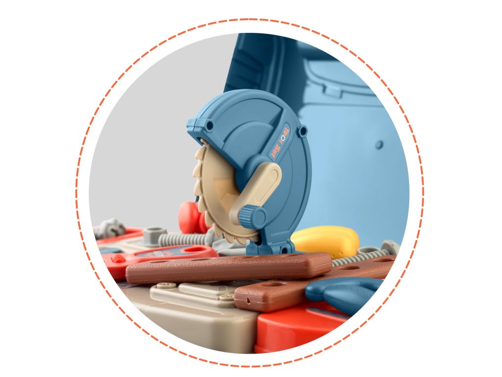 echipată cu rafturi și un set de unelte, care seamănă cu cele reale, dar din plastic, ușor de întreținut.În plus, sunt incluse câteva piese mobile, precum fierăstrăul circular,