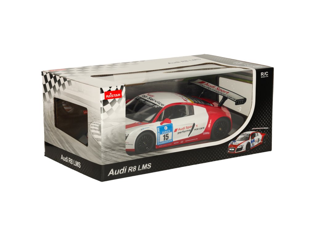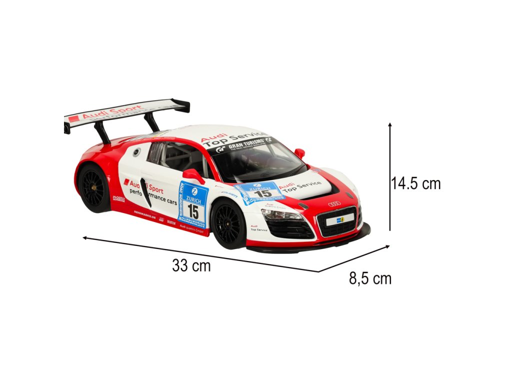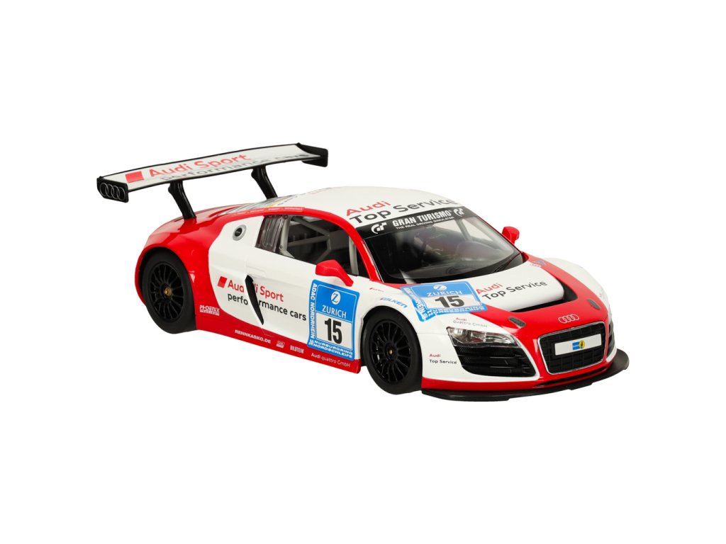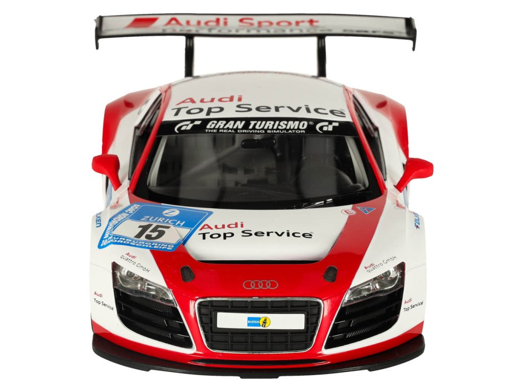 realistická reprodukcia - model Audi v mierke 1:14 verne reprodukuje detaily skutočného pretekárskeho vozidla GT vrátane loga Audi, aerodynamických línií a pretekárskych značiek