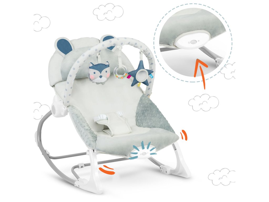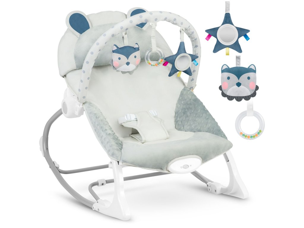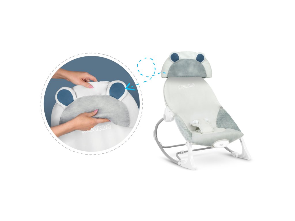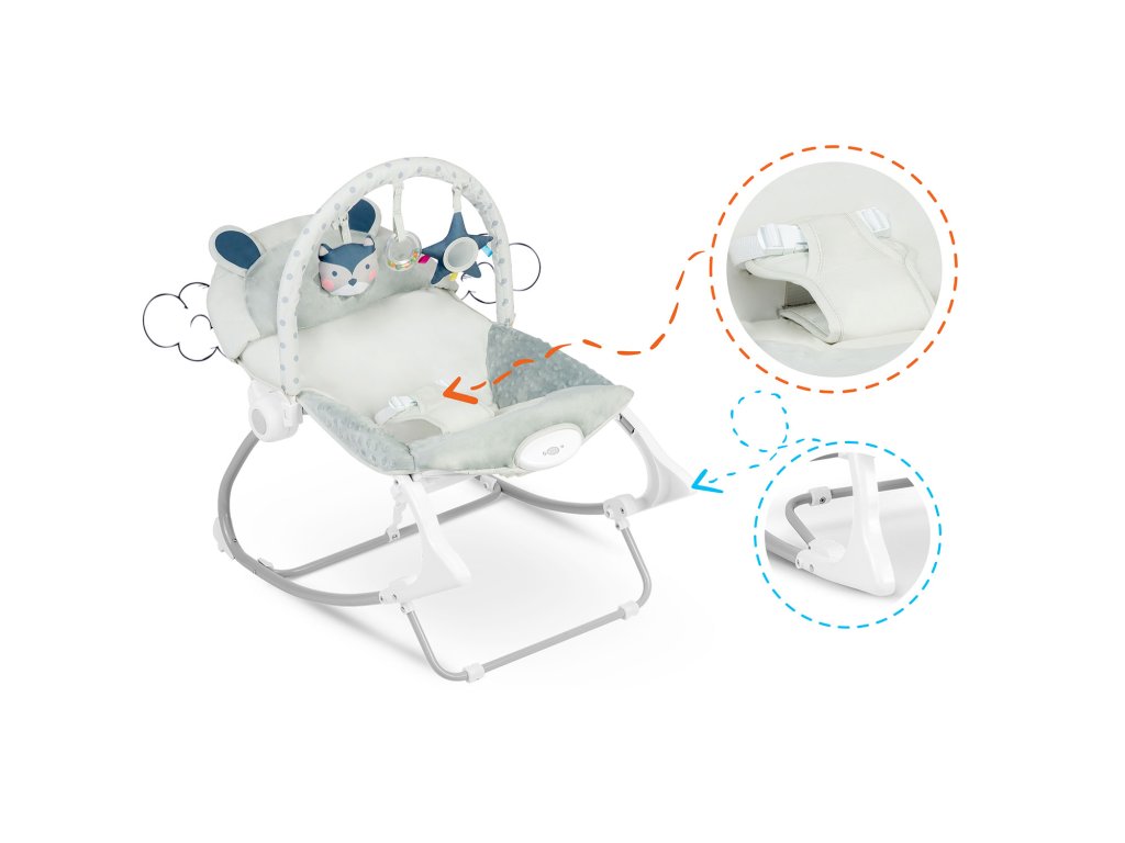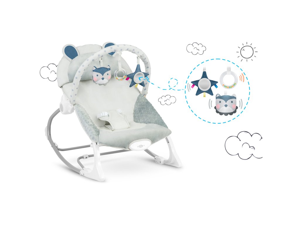 Leagănul este echipat cu o bară detașabilă cu jucării zornăitoare atașate. Acestea îi vor oferi copilului tău divertisment, în timp ce tu vei putea să te odihnești. Aceste jucării speciale stimulează vederea și dezvoltă simțul tactil.