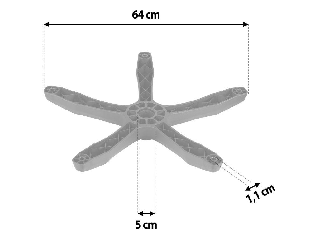 Baza din nylon - bază standard pentru scaune și scaune de birou, de culoare neagră universală. Cu un diametru al orificiului pentru pistonul cu gaz de 50 mm și dimensiunile tijei roților de 11 mm, baza oferă un suport stabil. Lungimea brațului este de 31 cm, iar diametrul întregii baze este de 64 cm.