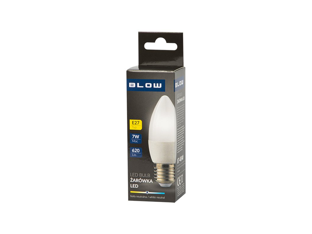 Specificație:Tehnologie: LEDTip soclu: E27Formă: lumânarePutere: 7WStrălucire: 520lmCuloare lumină: alb neutruTemperatura culorilor: 4000KTensiune de alimentare: 220-240 V AC, 50/60 HzClasa de energie: A+ Becul mărcii BLOW a fost fabricat cu soluții moderne utilizând tehnologia inovatoare LED, care se caracterizează prin eficiența ridicată a parametrilor de iluminare, redarea fidelă a culorilor obiectelor luminate și o durată de viață extraordinar de lungă. .Parametri suplimentari