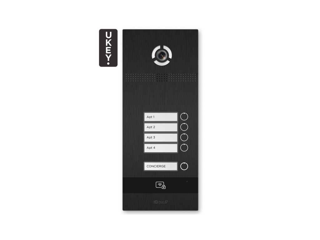 Panoul exterior BI-04FB Black de la BasIP este destinat instalării unei interfoane în tehnologia IP. Panoul are 4 butoane pentru utilizatori și 1 buton de tip "Concierge". BI-04FB se remarcă prin designul său modern și funcționalitatea extinsă; este echipat cu un cititor fără contact conform standardelor Mifare și Unique și este complet integrat cu sistemul de deschidere UKEY (cod QR, NFC și Bluetooth BLE). Dispozitivul permite integrarea totală cu orice sistem de securitate și automatizare printr-o interfață API deschisă.