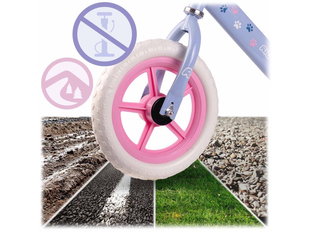 - roți mari, solide, din spumă EVA cu anvelope durabile, care oferă stabilitate și fluiditate în mers. Funcționarea silențioasă face bicicleta neobstrucționantă chiar și în interior.