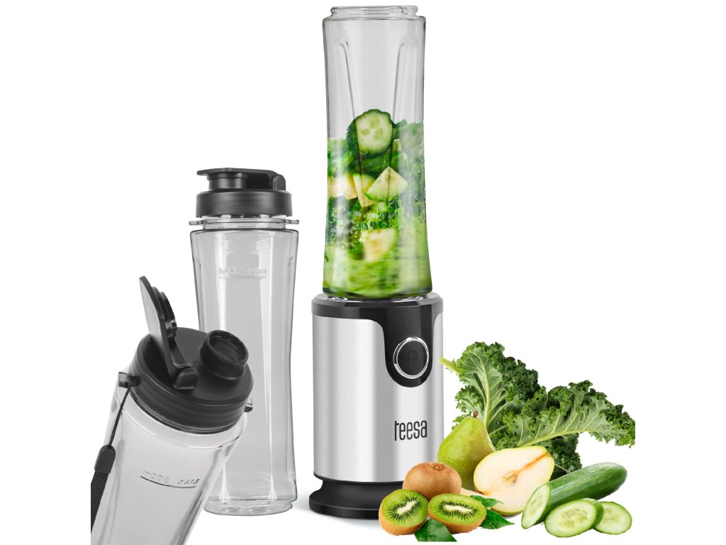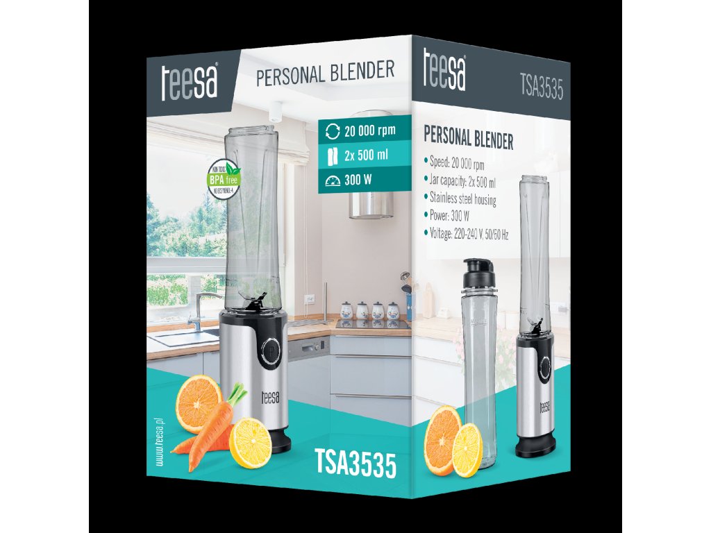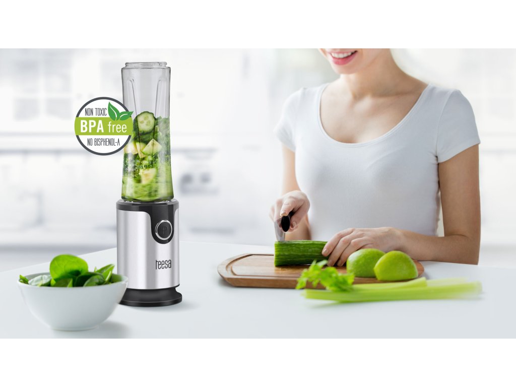 Blenderul personal Teesa este destinat persoanelor active și celor care încearcă să aibă grijă de sănătatea lor în ciuda lipsei de timp. Aparatul este foarte ușor de utilizat și ține pasul cu tine în orice situație. Trebuie doar să alegi fructele sau legumele proaspete preferate și să adaugi puțin iaurt sau apă. Blenderul funcționează la o viteză de 20000 de rotații pe minut, ceea ce, combinat cu puterea sa de 300W, transformă rapid aceste ingrediente într-un smoothie delicios. Este important că îl pregătești direct în paharul de 500 ml, pe care apoi îl poți închide cu capacul inclus pentru transport ușor și să-l iei oriunde dorești: la muncă, la școală, la plimbare sau la antrenament. Setul vine cu două pahare (făcute din tritan fără BPA), așa că poți decide dacă le iei cu tine și îți servești prietenul sau îți bucuri jumătatea și înlocuiești tradiționalele sandvișuri de la muncă cu desertul său sănătos preferat.Siguranța în utilizare a blenderului Teesa este asigurată de piciorușele antiderapante și de mecanismul de blocare împotriva asamblării incorecte. Aparatul ocupă foarte puțin spațiu și, datorită carcasei din oțel inoxidabil, se potrivește bine în orice bucătărie și va servi mulți ani. Putere: 300 W