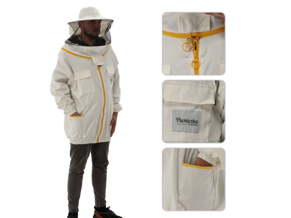 Cămașă de apicultor din bumbac, cu fermoar și pălărie detașabilă.Datorită materialului gros, utilizatorul se va simți confortabil și în siguranță în timpul lucrărilor din stup.