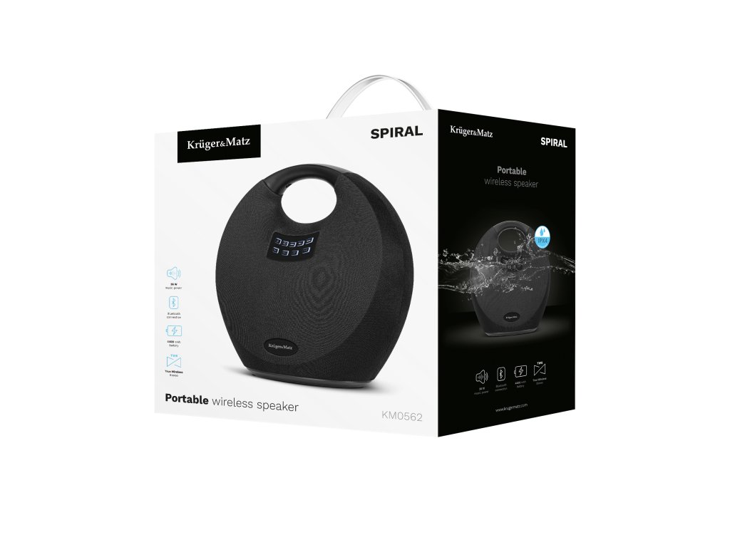 Boxa Spiral Kruger&Matz este produsul perfect pentru cei care adoră să se joace în aer liber. Datorită standardului IPX4, chiar dacă sunteți surprinși de o ploaie ușoară în timpul unui eveniment sau a unui foc în aer liber, vă puteți bucura de distracție fără griji de deteriorare a dispozitivului.
