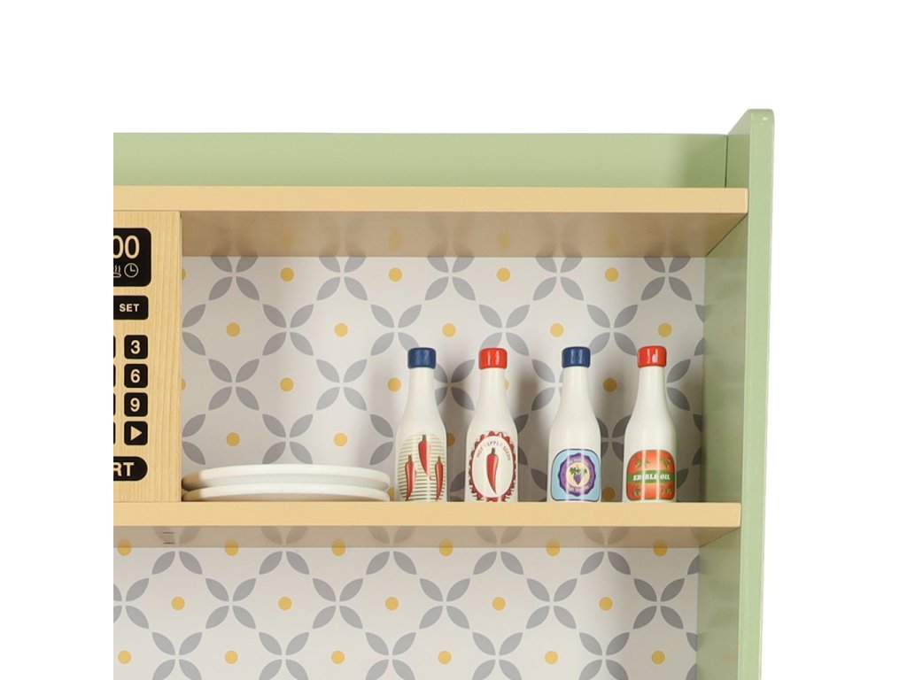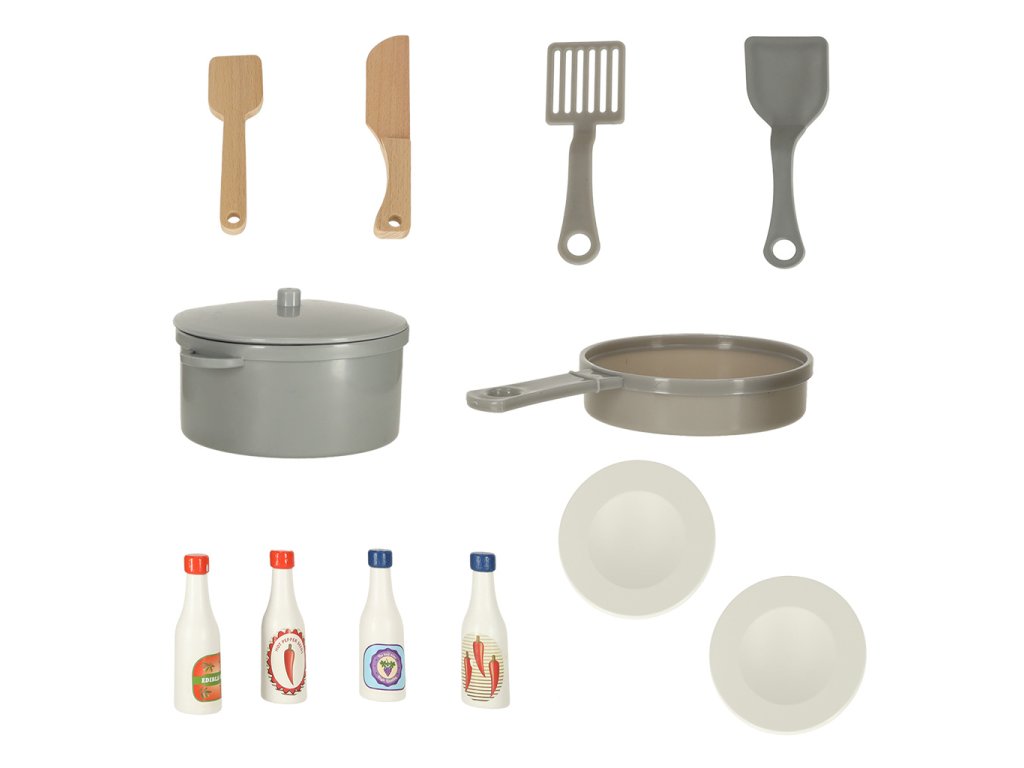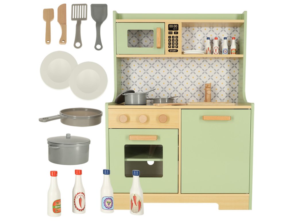 Nicio bucătărie nu este completă fără accesorii suplimentare care facilitează gătitul, astfel că această bucătărie vine și cu o mulțime de ustensile pentru ca micuțul tău să se simtă ca un bucătar adevărat! Setul include, printre altele, o tigaie și o oală din plastic cu capac, spatule de plastic pentru gătit, tacâmuri de lemn și două farfurii.