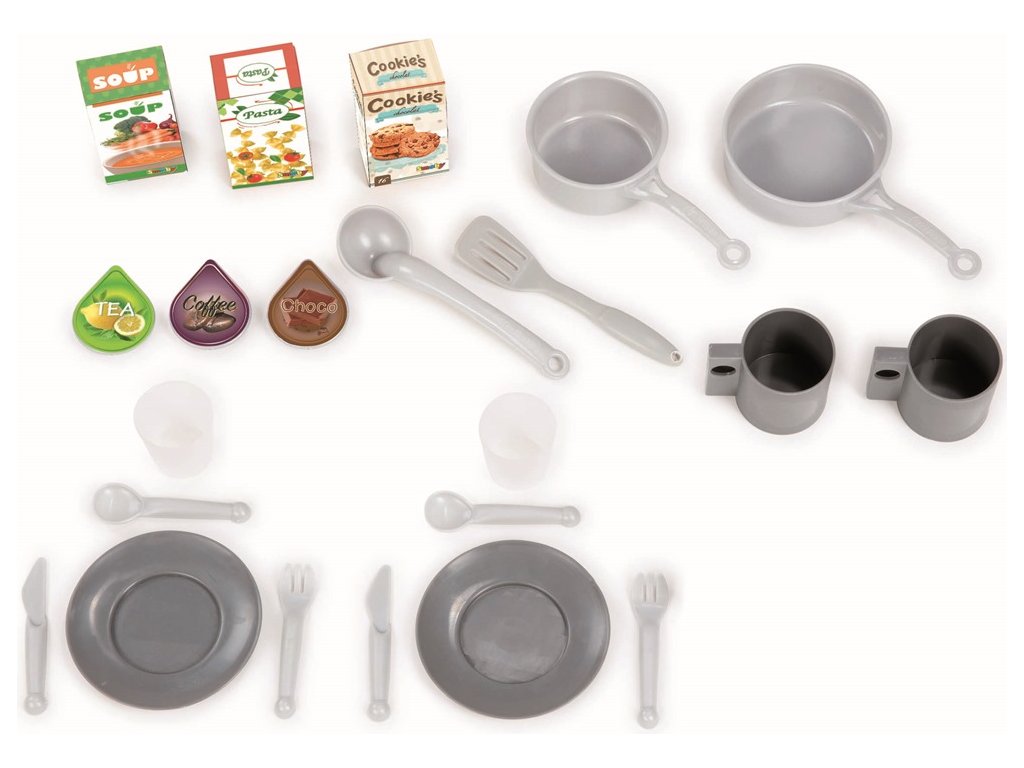 22 accesorii (2 tigăi, 2 farfurii, 2 furculițe, 2 cuțite, 2 linguri, 2 căni, 2 pahare, 3 capsule, 2 ustensile de bucătărie, 3 alimente. Toate accesoriile sunt realizate din plastic și/sau carton)
