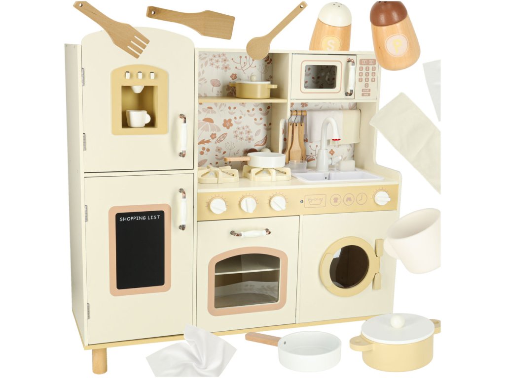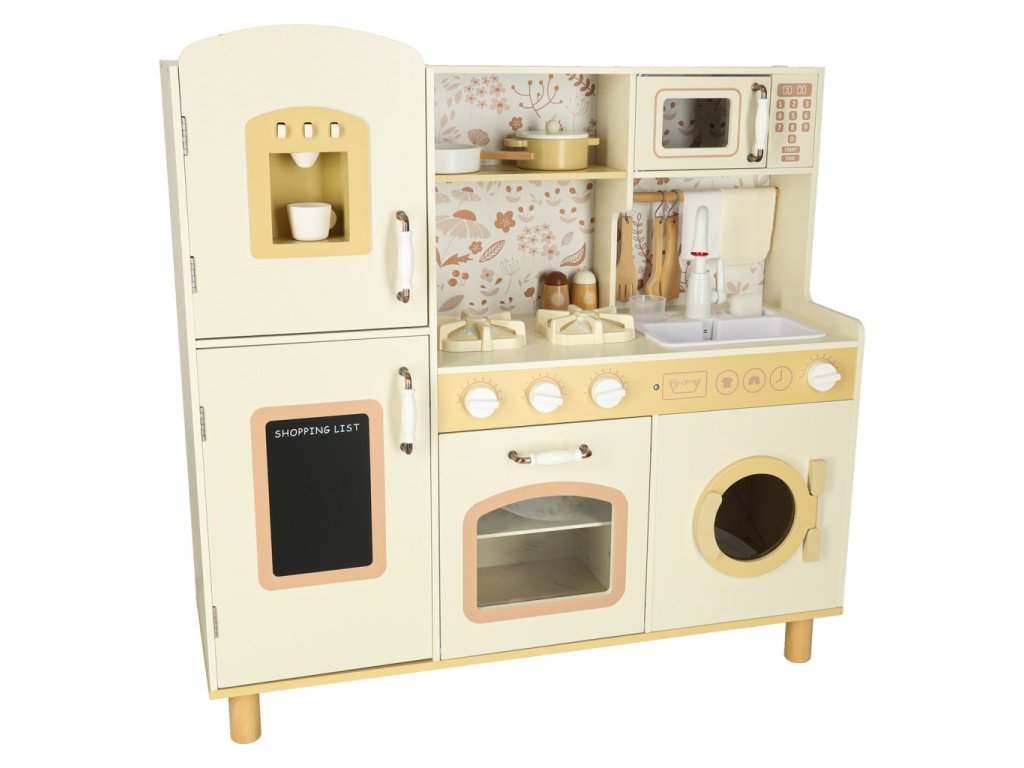 Bucătăria din lemn pentru copii include accesorii, precum cana, oala, tigaia, ustensilelede bucătărie, solnița și piperiera, precum și o mașină de spălat, un cuptor cu microunde, cuptor, chiuveta cu funcție de turnare și dulapuri de depozitare. Datorită acestora, jocul creativ devine o activitate zilnică și copilul învață să se miște liber și să mențină ordinea în spațiul său de bucătărie.