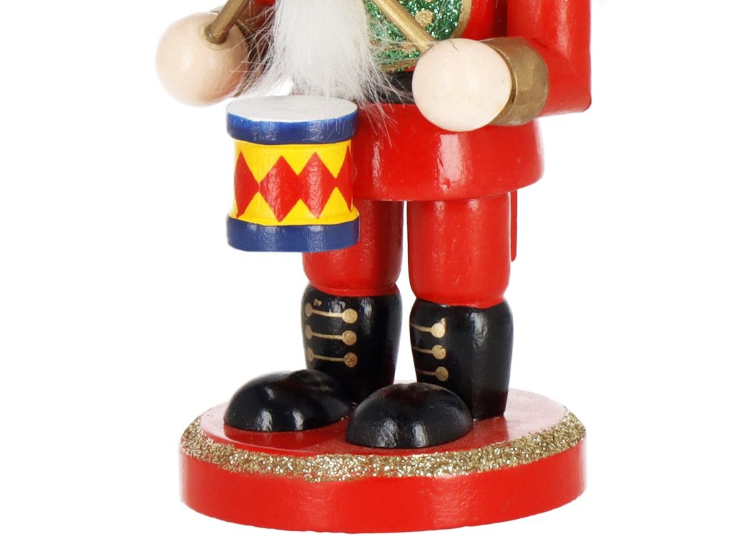 - Elemente de construcție: șapcă roșie cu cozoroc, îmbrăcăminte roșie, pantofi negri, față cu ochi și mustață, nas proeminent, păr și barbă gri, deschidere pentru nucă în gură, deschisă prin ridicarea pârghiei din spate, tobă, în mâini bețe pentru tobe