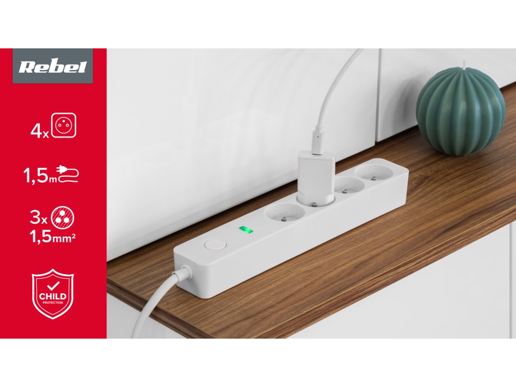 Protecție pentru copiiCablu de prelungire cu alimentare Rebel este echipat cu capace de protecție încorporate pentru contactoarele din prize. Astfel, protejează eficient sănătatea și viața celor mici, protejându-i de la introducerea degetelor sau a altor obiecte.