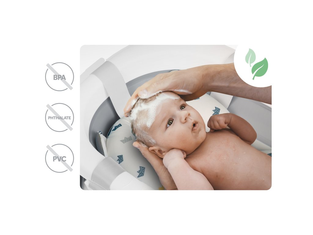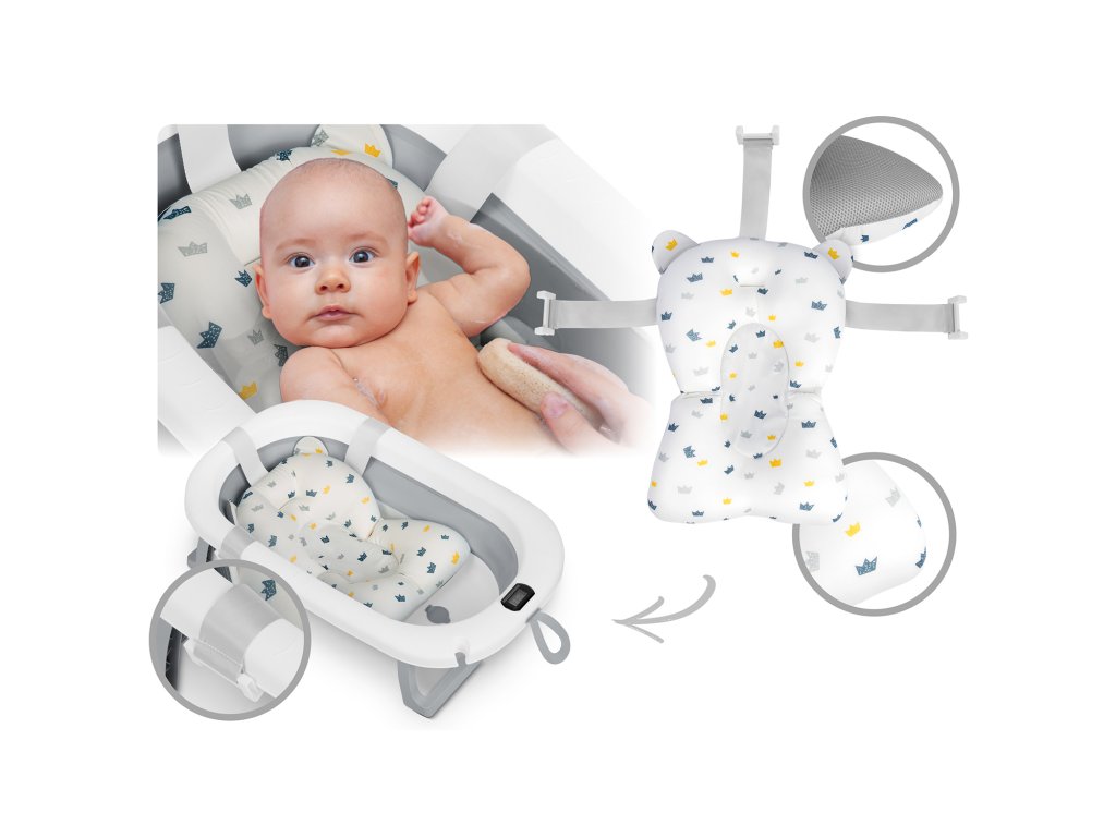 Include o inserție delicată, profilată, care susține ușor capul și spatele copilului. Cu ajutorul celor trei mâneri solide, o fixezi sigur pe marginile cădiței – fără să alunece, fără stres. Inserția este realizată dintr-un material cu uscare rapidă, așa că după baie o scoți și o scurgi instantaneu. Confort maxim și igienă în timpul fiecărui moment petrecut în apă!