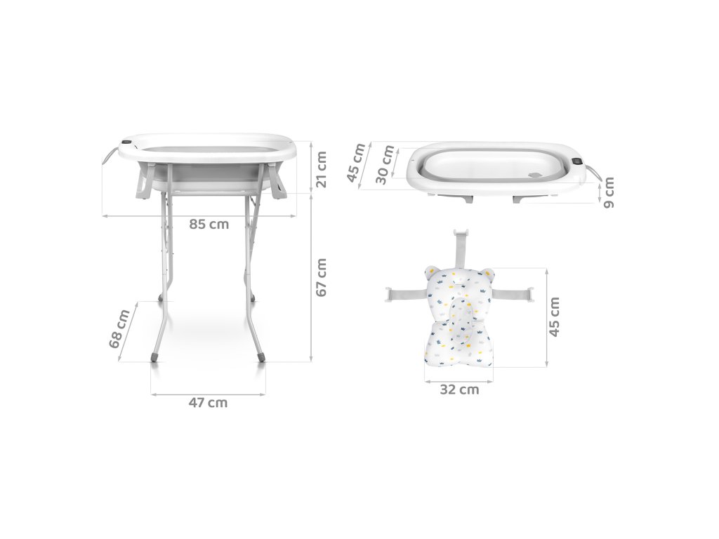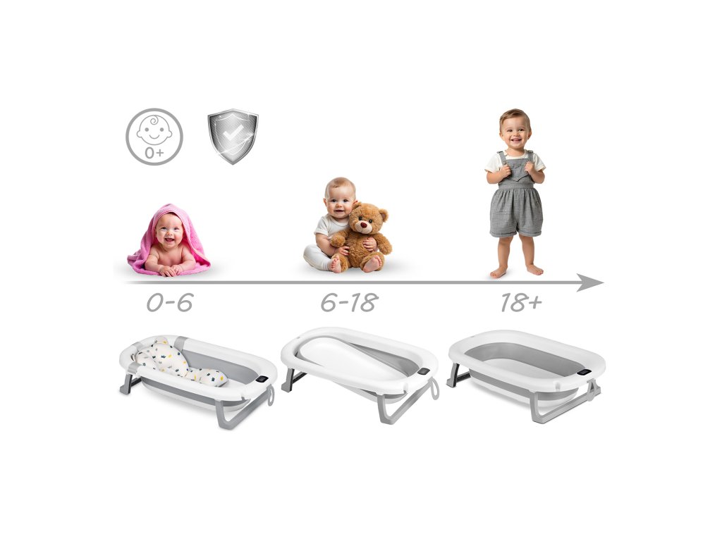 Această cădiță universală poate fi destinată atât pentru baia bebelușilor, cât și a copiilor ceva mai mari, de câțiva ani.Copiilor le este suficient să umpli cu 15-20 litri de apă și să susții în siguranță bebelușul întins pe o inserție specială sau pe fundul înclinat al cădiței. Dar datorită capacității sale mari de 45 de litri, cădița poate servi mult mai mult timp și cu umplere completă se poate îmbăia confortabil un copil de 2 sau 3 ani.