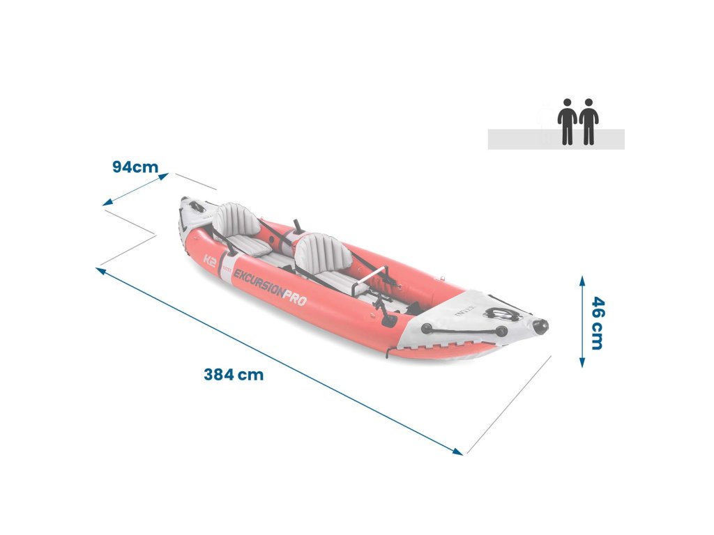 - Dimensiunile sale de 384 x 94 x 46 cm asigură confortul și libertatea pentru 2 persoane. Caiacul este capabil să suporte o încărcătură de până la 180 kg.