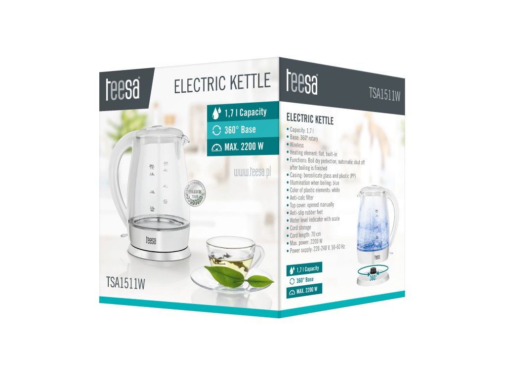 Te întrebi, ce fierbător să alegi  Vă recomandăm modelul TSA1511, al cărui design va atrage pe oricine apreciază modernitatea. Fierbătorul de sticlă Teesa va fi o decorație proeminentă în bucătăria ta, datorită sticlei în combinație cu iluminarea albastră care apare atunci când apa fierbe și a posibilității de a alege dintre două versiuni de culoare (alb sau negru).