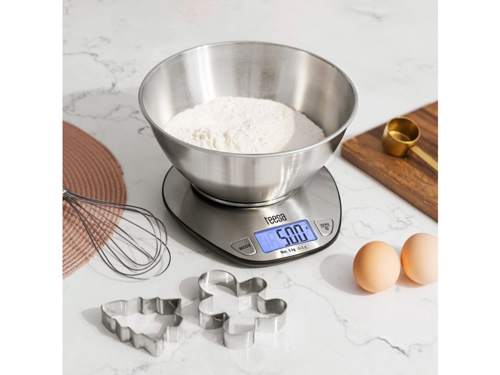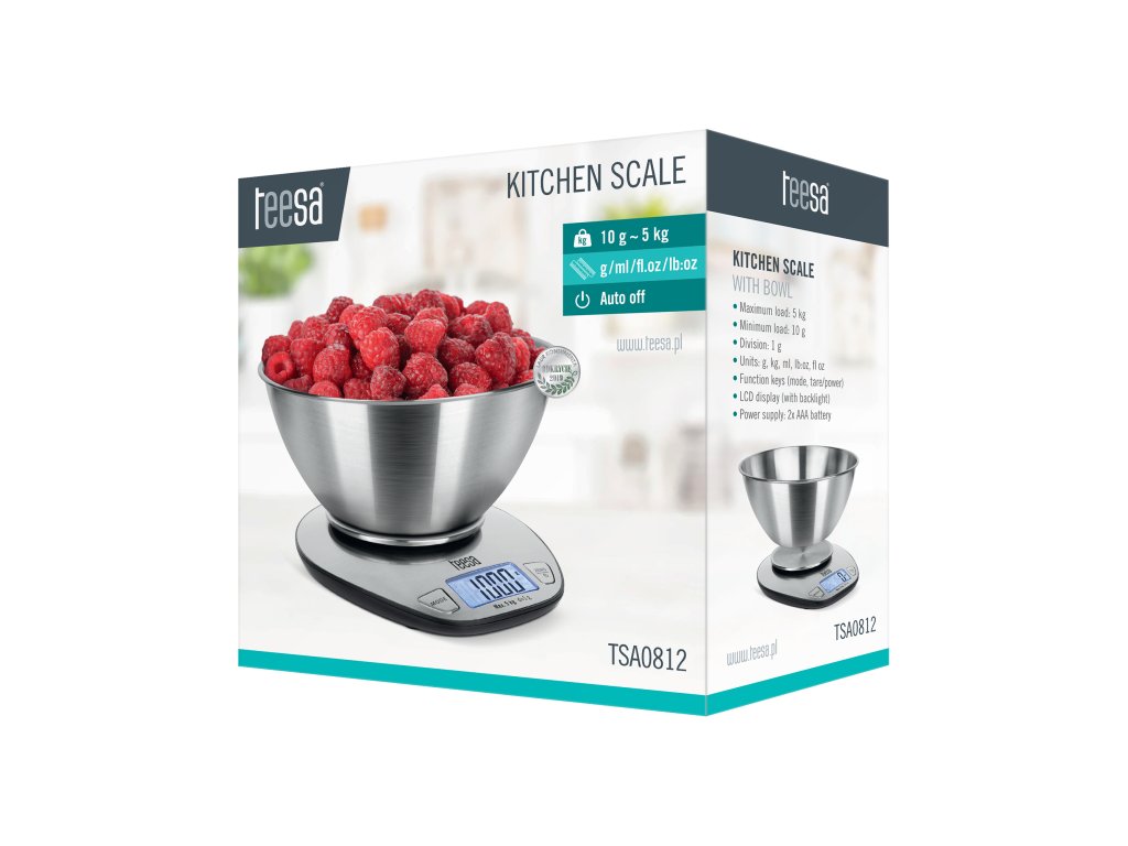 Cântarul pentru alimente Teesa are un alt avantaj. Un bol practic vă permite să cântăriți nu numai produse solide, ci și lichide. Pur și simplu schimbați setarea unității în mililitri și turnați, de exemplu, apă, iar cântarul vă va oferi cu ușurință o măsurare precisă. Cântarul de bucătărie electronic Teesa suportă unități precum grame, kilograme, mililitri, uncii și livre.