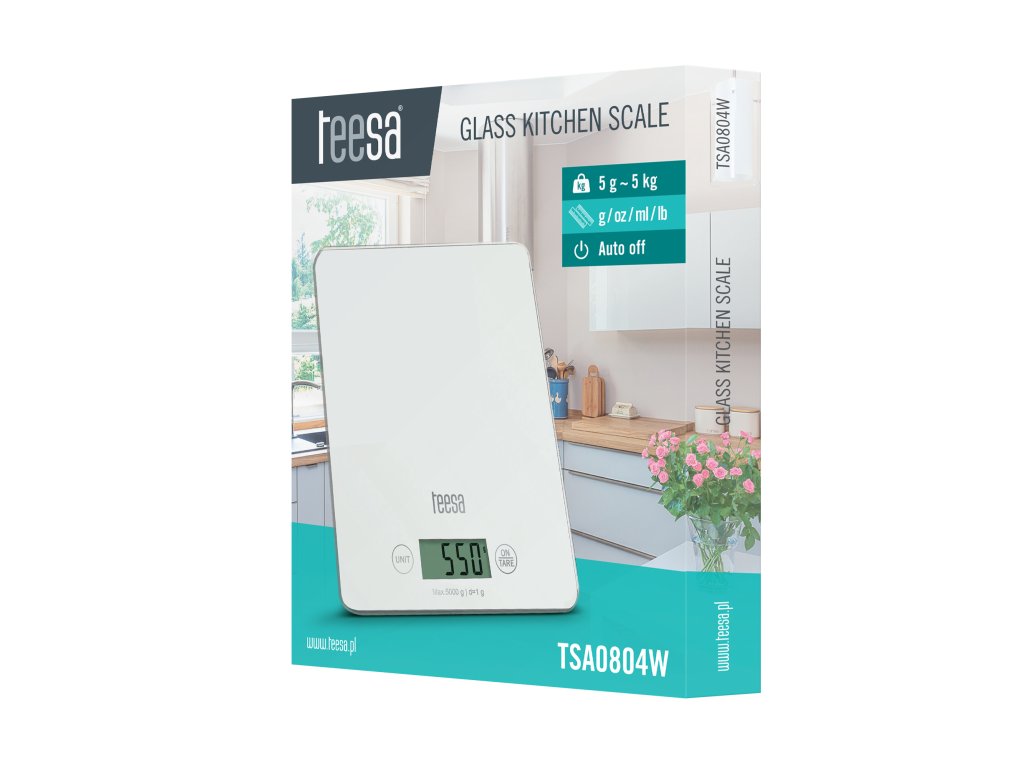 O componentă esențială pentru fiecare gospodină și un dispozitiv fără de care munca în bucătărie poate fi greu de imaginat. Cântarul de bucătărie Teesa cu o capacitate maximă de 5 kg măsoară cu precizie cantitatea de produse necesare pentru coacerea acasă. Un mare avantaj al TSA0804 este, fără îndoială, funcția de tară, care permite măsurarea greutății produsului în sine. Cântarul este echipat cu un ecran LCD ușor de citit, care afișează valorile măsurate în una dintre cele patru unități - grame, mililitri, livre sau uncii. În plus, TSA0804W are picioare anti-alunecare care asigură o stabilitate corespunzătoare.Sticla albă călită din care este fabricată platforma de cântărire garantează nu numai o durabilitate remarcabilă, ci și un aspect elegant - cântarul de bucătărie nu va mai fi doar un instrument de măsurare, ci va deveni și un accesoriu rafinat pentru interiorul bucătăriei. Produsul este disponibil și în culoarea neagră. Capacitate maximă: 5 kg