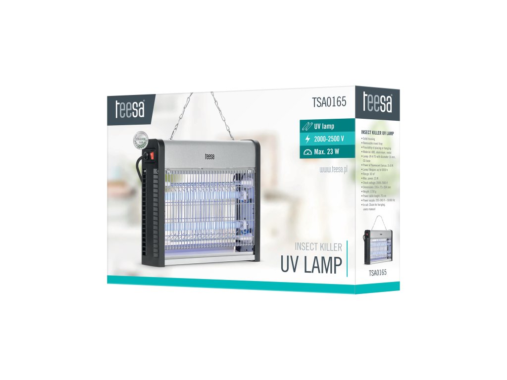 Lampa ultravioletă pentru insecte Teesa are un recipient detașabil pentru insecte pentru golirea rapidă și ușoară. Este important să fie proiectată astfel încât să poată fi așezată sau agățată.