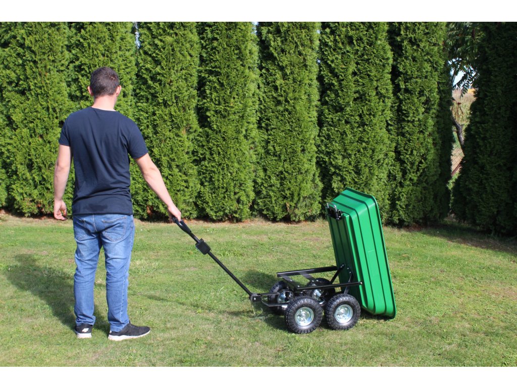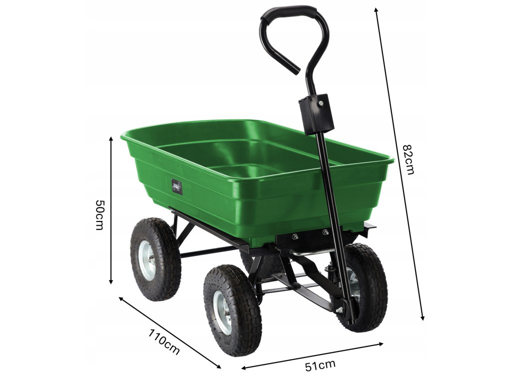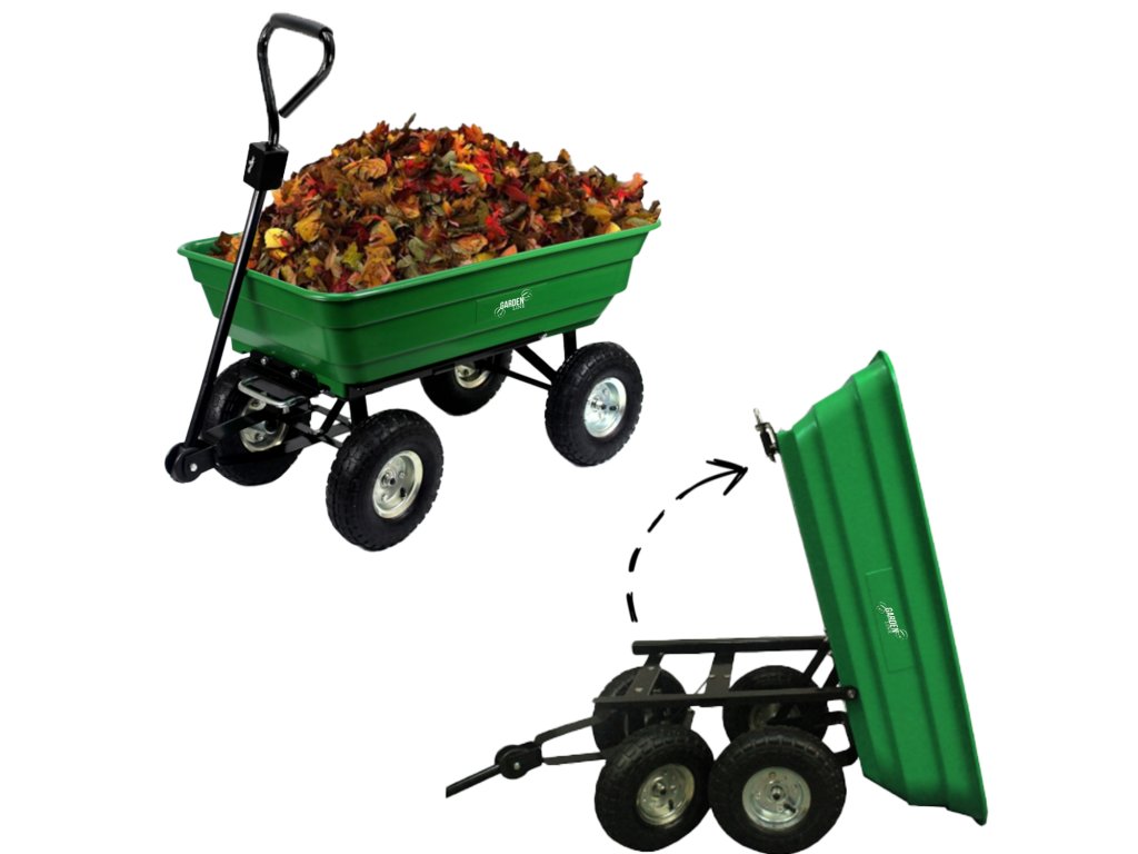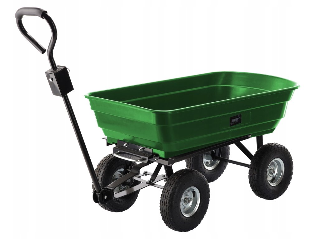 Carucior de grădină dublu funcțional de culoare verde, destinat transportului de încărcături de până la 300 kg. Echipat cu roți solide, materiale rezistente și un mâner confortabil, ideal pentru lucru în grădină și nu numai.