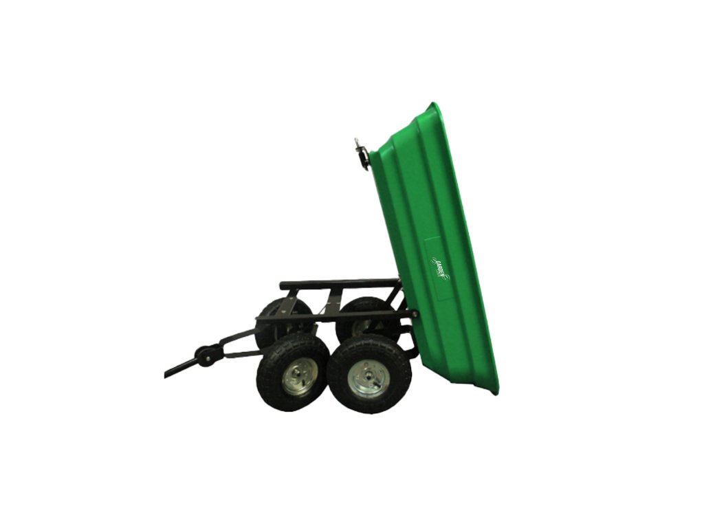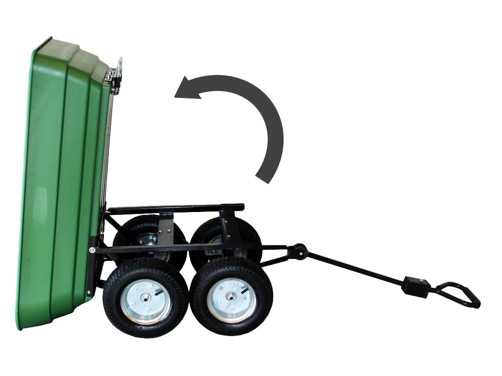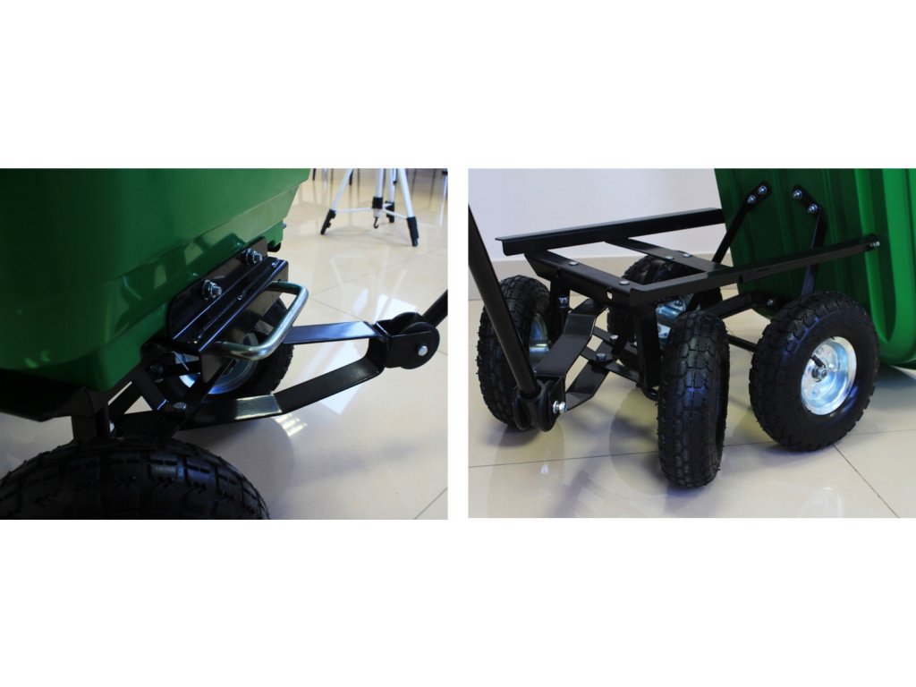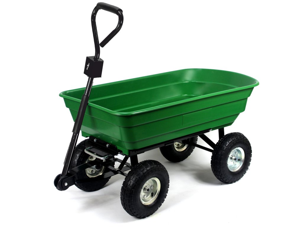 Carucior de grădină dublu funcțional de culoare verde, destinat transportului de încărcături de până la 300 kg. Echipat cu roți solide, materiale rezistente și un mâner confortabil, ideal pentru lucru în grădină și nu numai.