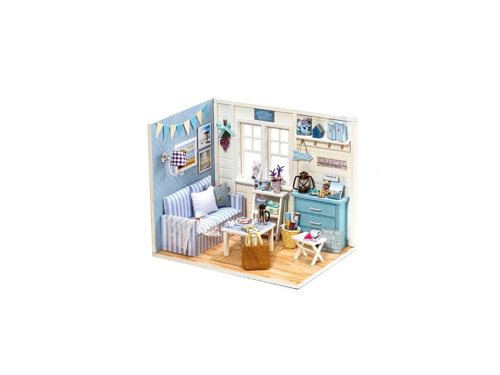 O cameră din lemn minunată, proiectată astfel încât să o puteți asambla voi înșivă într-un aranjament albastru magnific.