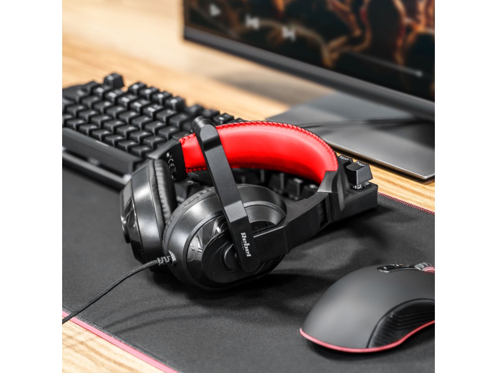 Căștile cu fir Rebel GH-10 cu microfon nu oferă doar un sunet excelent, ci și un design modern și confort. Pernuțele confortabile și banda de susținere acoperite cu piele ecologică moale garantează un confort ridicat chiar și în timpul maratoanelor lungi de joc. În plus, combinația de culoare neagră cu elemente roșii le conferă un aspect de gaming și atrage atenția.