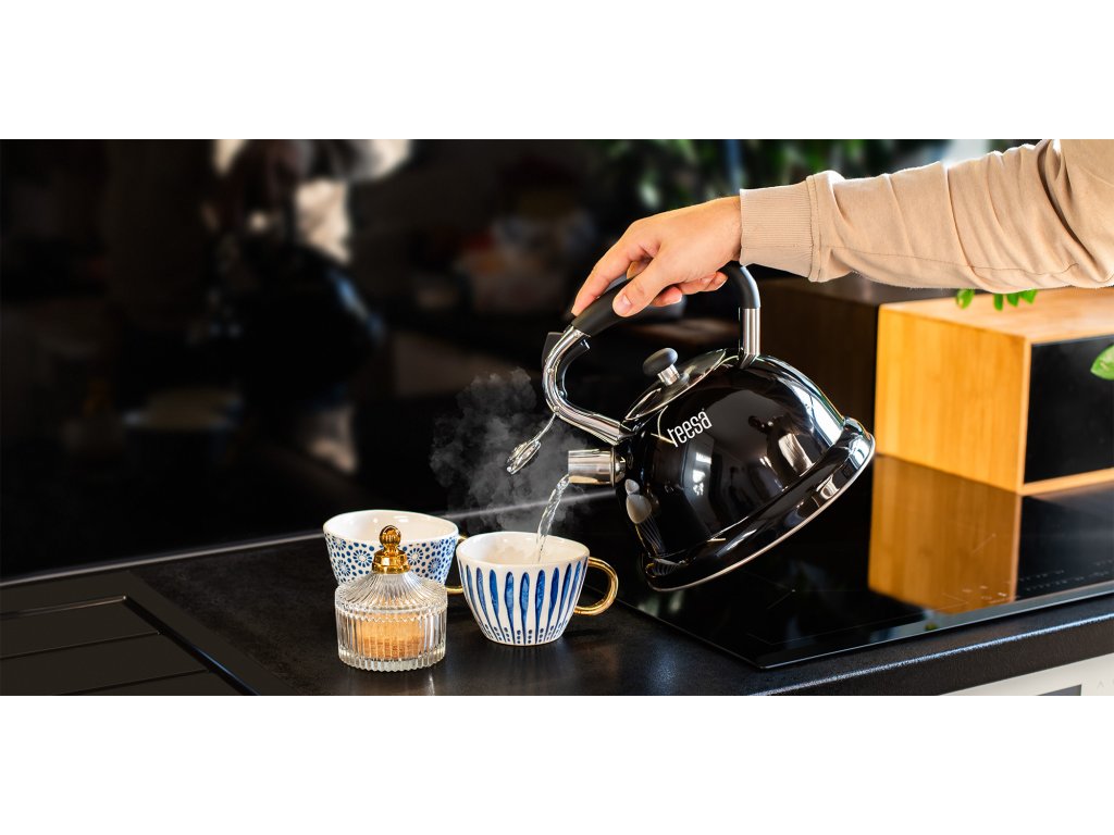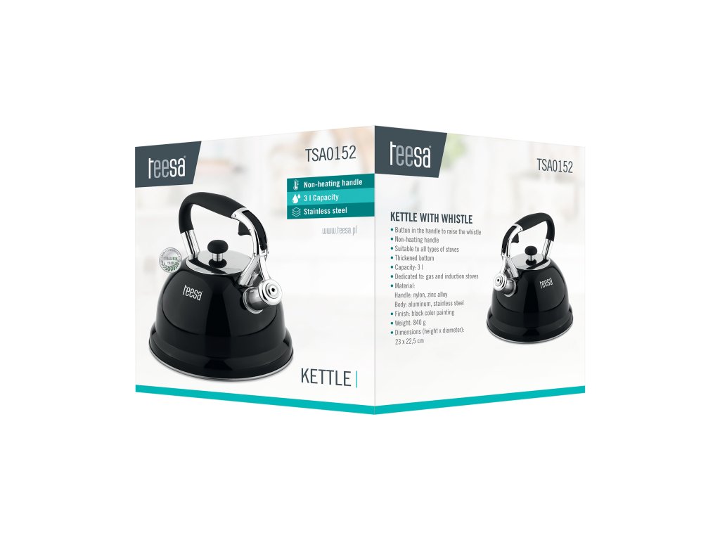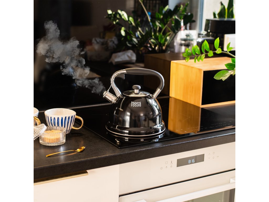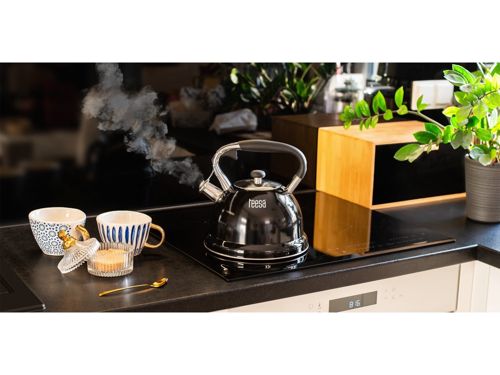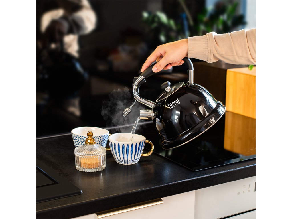 Designul elegant al ceainicului Teesa asigură că se va potrivi perfect în bucătăria ta. Mânerul din nylon rezistent, corpul din oțel inoxidabil și finisajul negru lucios creează un design modern care asigură și o curățare ușoară.