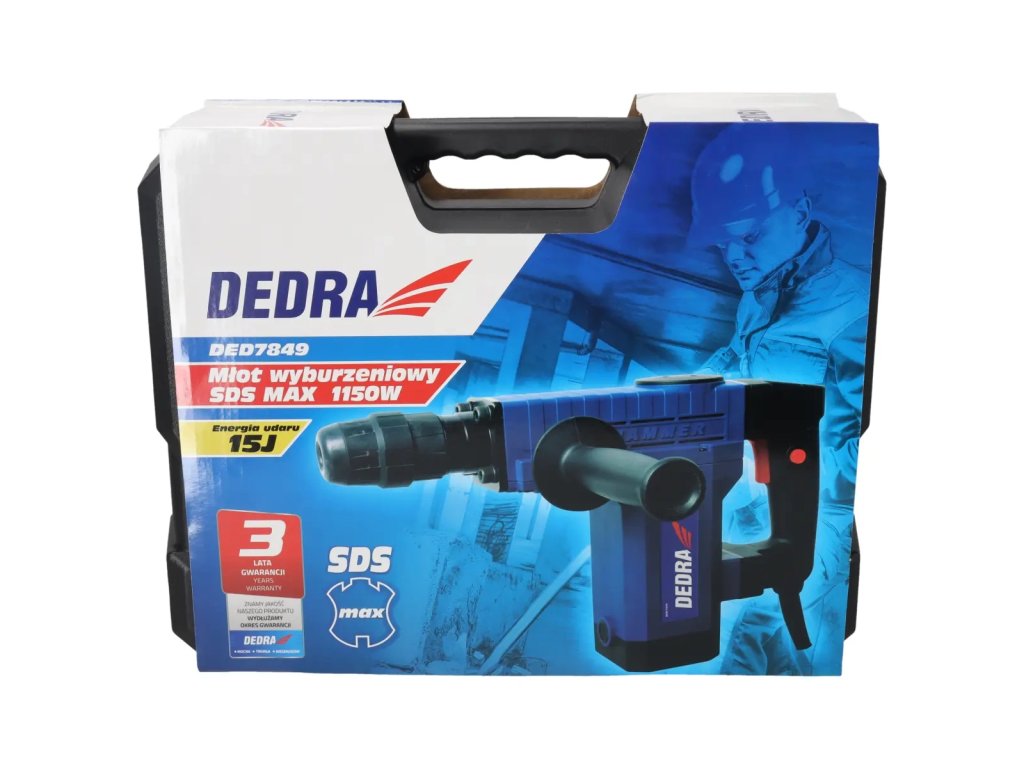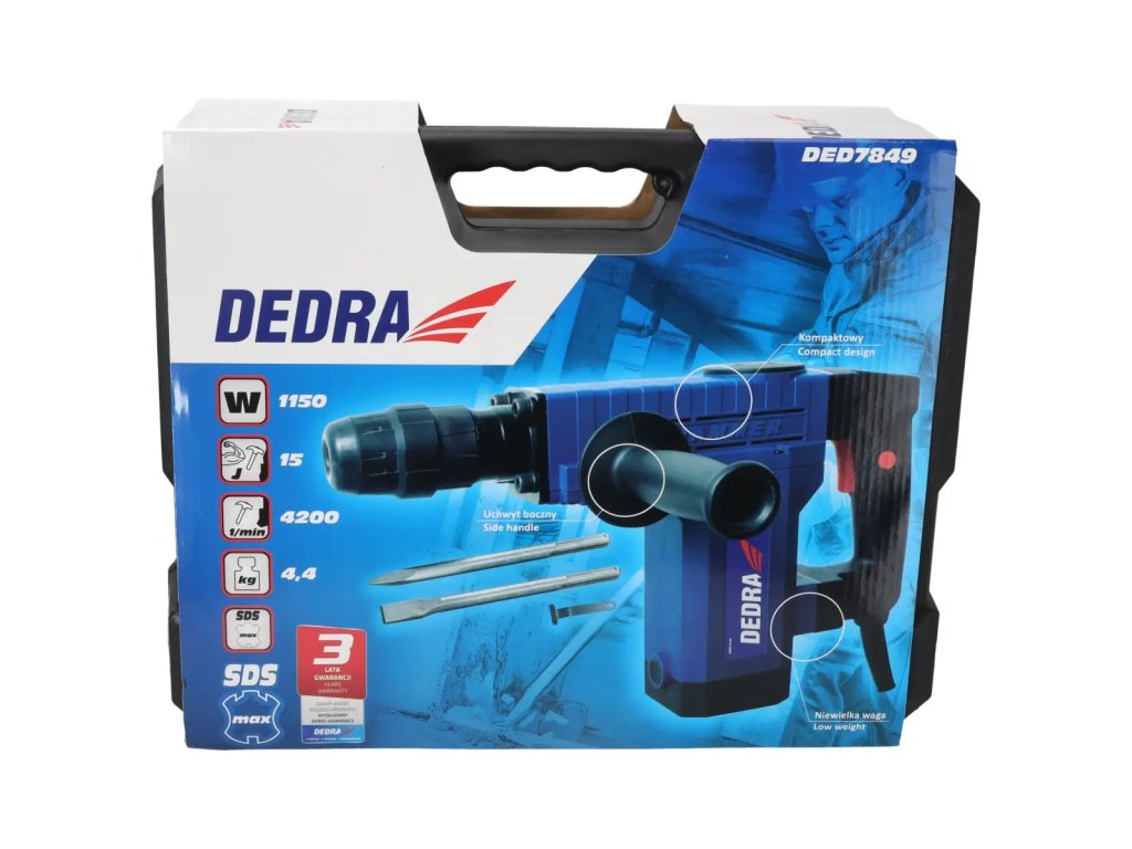 Ciocanul demolator DED7849 este ideal pentru lucrări de demolare. Este un instrument ideal pentru instalatori: electricieni, instalatori, montatori de climatizare. Două mânere ergonomice oferă control total. Mânerul principal în formă de "D" este echipat cu un comutator de pornire pentru operare continuă. Performanță ridicată și mecanism de percuție extrem de eficient la o greutate relativ scăzută. Forța de impact ridicată de 15 J permite dăltuirea și a betonului foarte dur.Caracteristici: