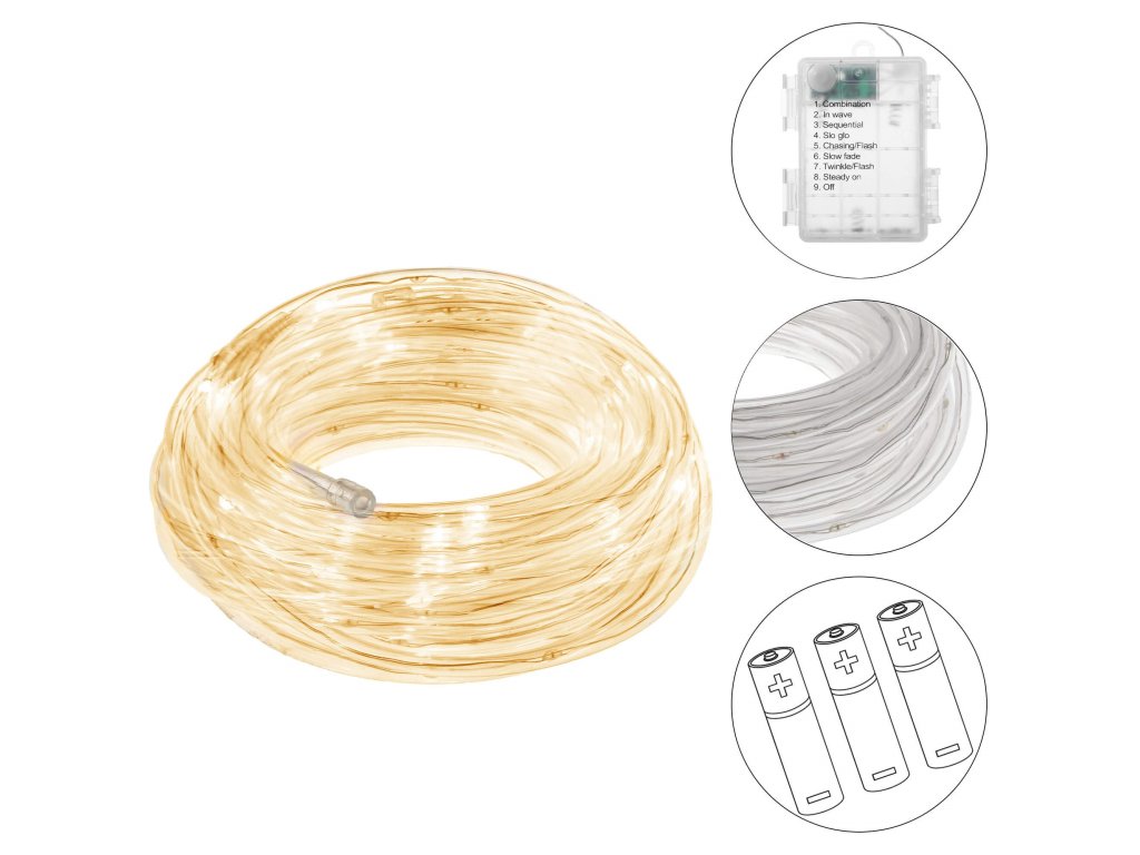 - Lungimea setului: 5,7 m (secțiune luminoasă cca 5 m + cablu + priză)