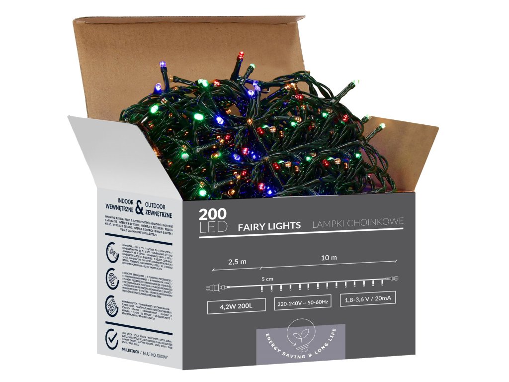 - Culoare diode: multicolor Număr diode: 200 LED Programator cu 8 funcții Funcție de memorie Lungime totală: 12,5 m Lungime parte cu diode LED: 10 m Culoare priză și izolație: priză neagră, izolație verde Alimentare: rețea Certificate: CE, RoHS Utilizare: exterior / interior Informații suplimentare: diode LED economice, posibilitate de conectare, conectori etanși