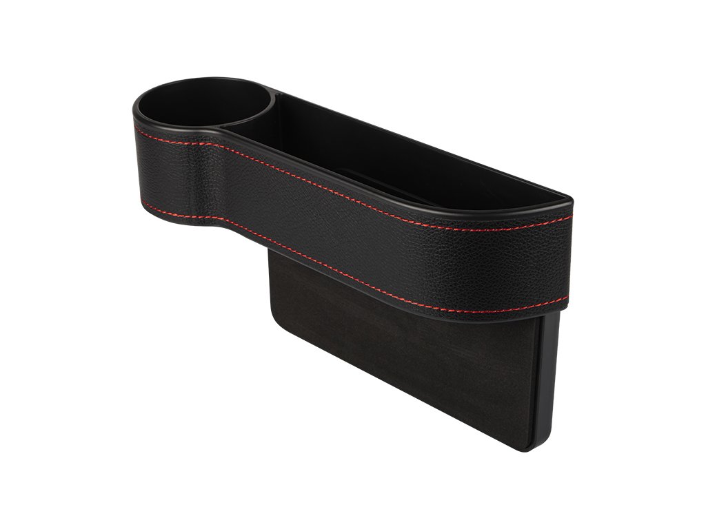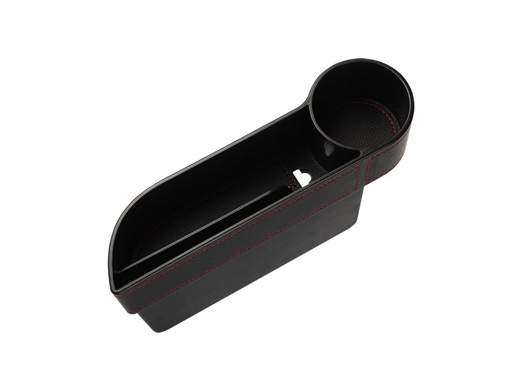 Spațiu pentru băuturi cu compartimente și suport pentru pahare proiectat pentru instalare pe partea stângă între scaunul pasagerului din față și cutia de viteze. Tapițeria neagră, deosebit de frumoasă, garantează că acest produs se potrivește în orice interior de vehicul, iar firul roșu subliniază un design unic și modern. În partea din față este instalat un suport pentru băuturi (pahar, sticlă, cutie sau sticlă).