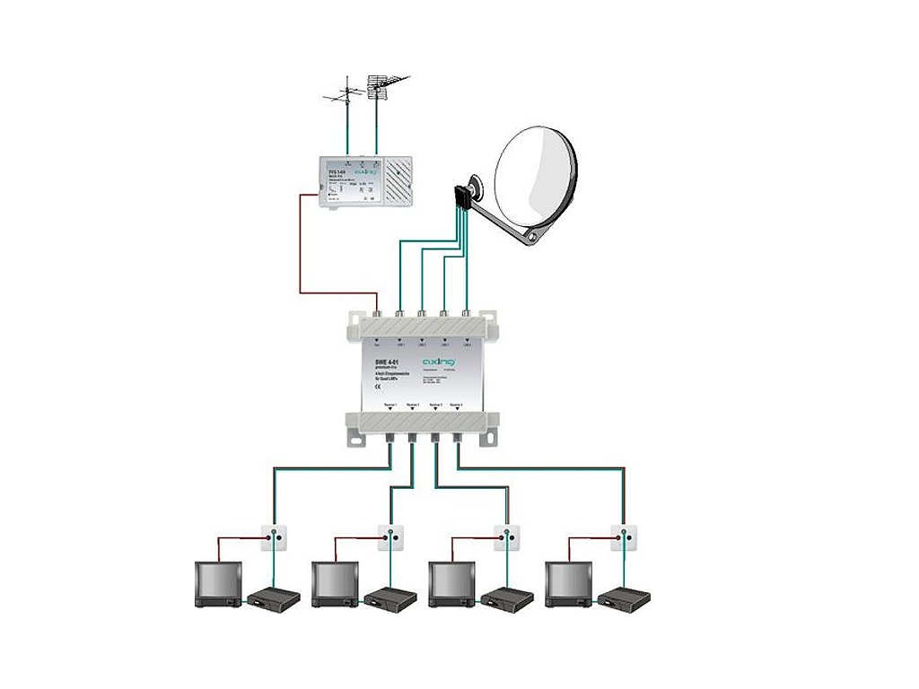 Combinatorul permite combinarea semnalului de la convertorul Quad cu semnalul TV terestru și trimiterea acestuia la patru prize SAT TV. Combinatorul are filtrare foarte extinsă la intrările individuale, astfel încât dispozitivul are o separare foarte bună între intrările SAT și TV. Convertorul Quad este un set de patru convertoare de bandă completă plasate într-o singură carcasă. Fiecare dintre aceste convertoare poate fi controlat, bineînțeles, individual. Prin urmare, instalația permite conectarea a patru receptoare de satelit care funcționează independent. Instalația permite, de asemenea, accesul la semnalele TV terestre.