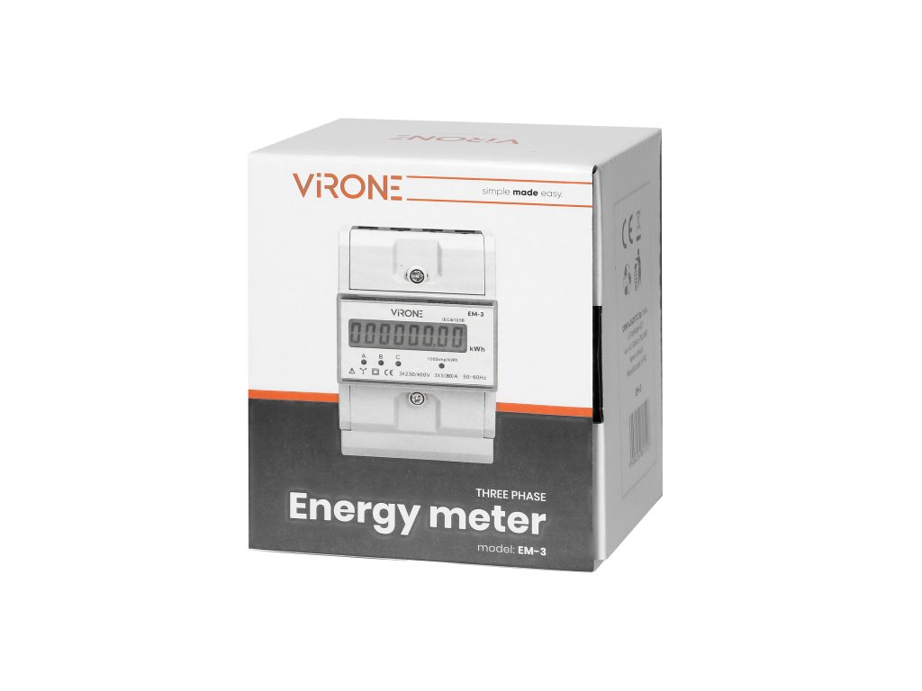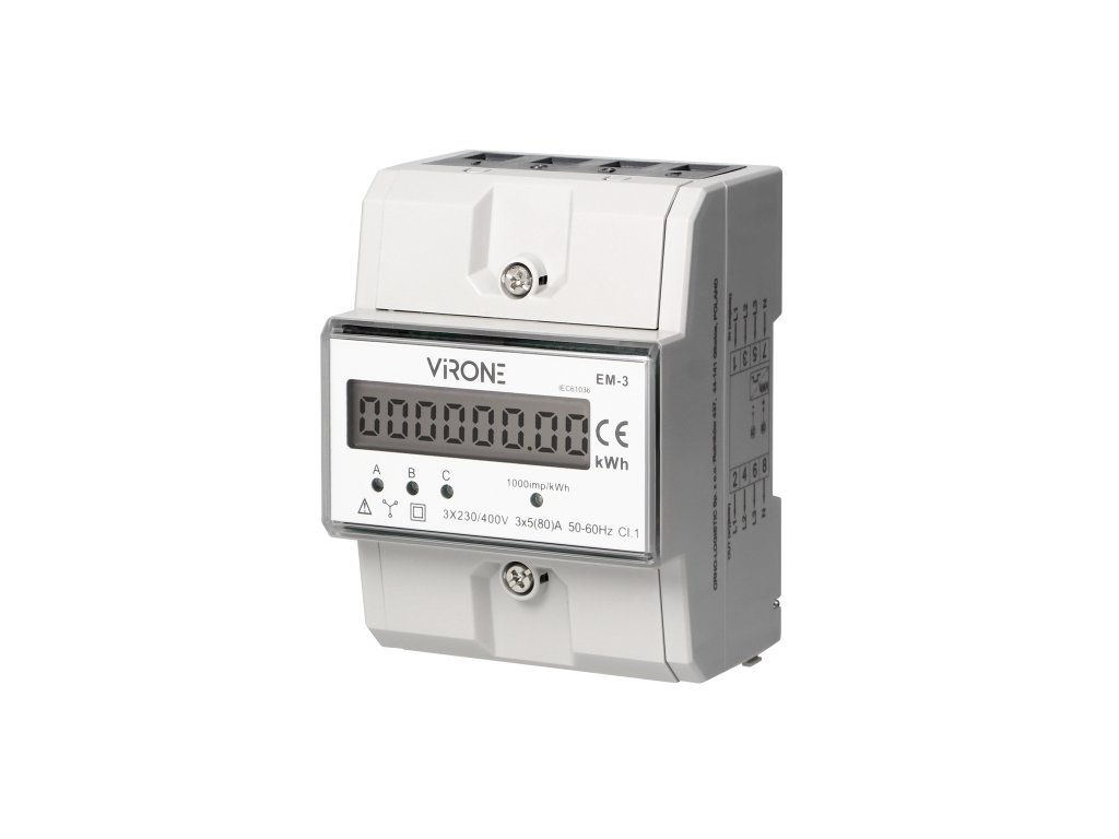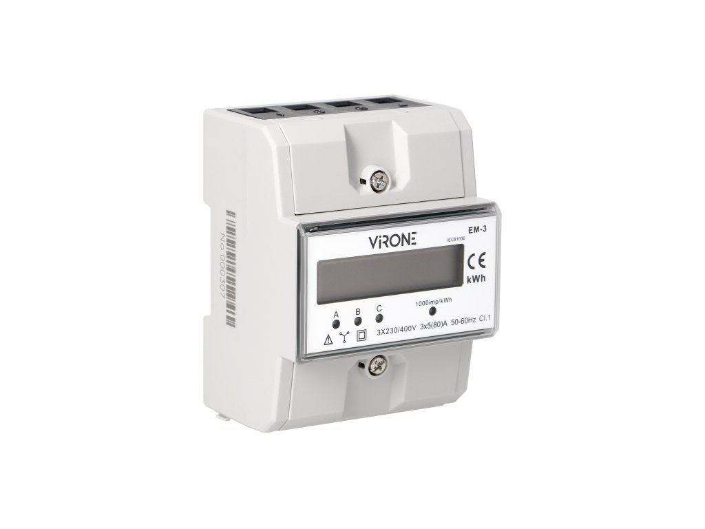 Acest contor de energie furnizează date în unități metrice (kWh) și este utilizat pentru măsurarea puterii active într-un sistem trifazic. Un sistem electronic special este influențat de curentul care trece și de tensiunea utilizată, generând astfel impulsuri al căror număr este proporțional cu energia electrică consumată. Consumul de energie în fază este indicat de o diodă LED care clipeste. În plus, numărul de impulsuri este calculat pentru a determina energia consumată, iar valoarea acesteia este afișată pe ecranul LCD (6+2). Alimentare: 230V~, 50Hz, curent de bază: 5A, curent maxim: 80A, curent minim: 0,25A, frecvența impulsurilor: 800 imp/kWh, clasa de precizie B, carcasa are dimensiunea de 3 module, potrivită pentru montarea pe șină DIN TH-35mm, ieșire de impuls: alimentare 12~27V, curent ≤27mA, impuls = 80ms.Parametri suplimentari