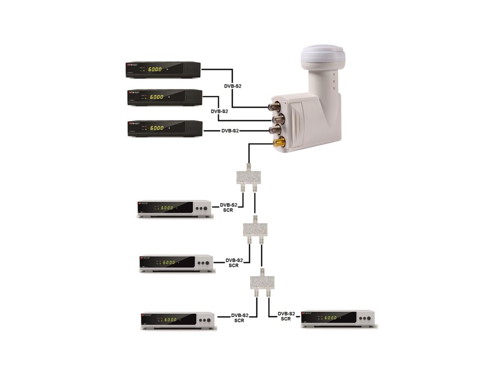 O ieșire a convertorului UNICABLE (SCR) de culoare aurie permite transmiterea semnalului printr-un singur cablu către max. 4 receptoare digitale cu semnal SCR sau UNICABLE. Trei ieșiri ale convertorului de culoare argintie permit conectarea a trei receptoare digitale tradiționale.