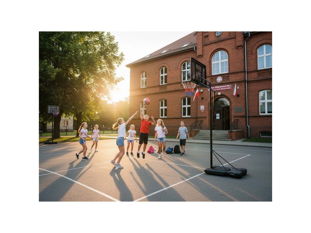 Două roți de transport solide din bază fac mutarea coșului o chestiune de secunde. Din teren pe alee, din garaj în spațiul de joacă al cartierului – fără ridicare, fără complicații. Pur și simplu îl împingi și joci.