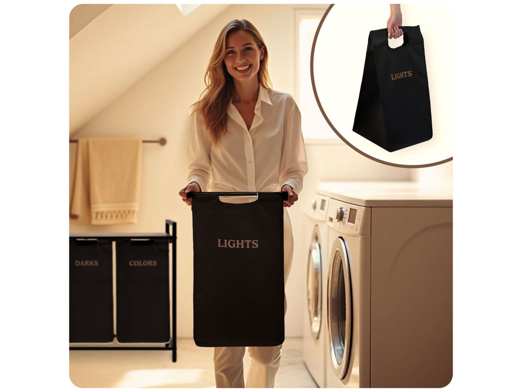Căptușeala cu mânere comode transformă coșul într-un sac practic pentru spălat. Odată umplut, trebuie doar să-l scoți și să-l transferi în mașina de spălat – economisești timp, eviți dezordinea și menții curățenia.