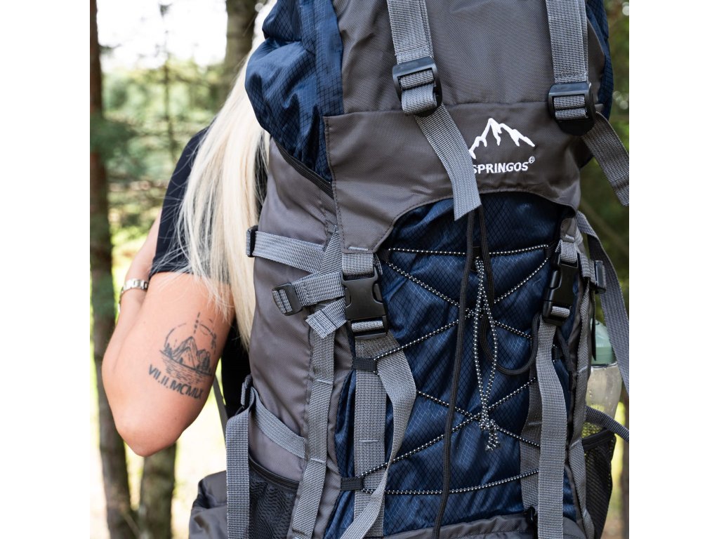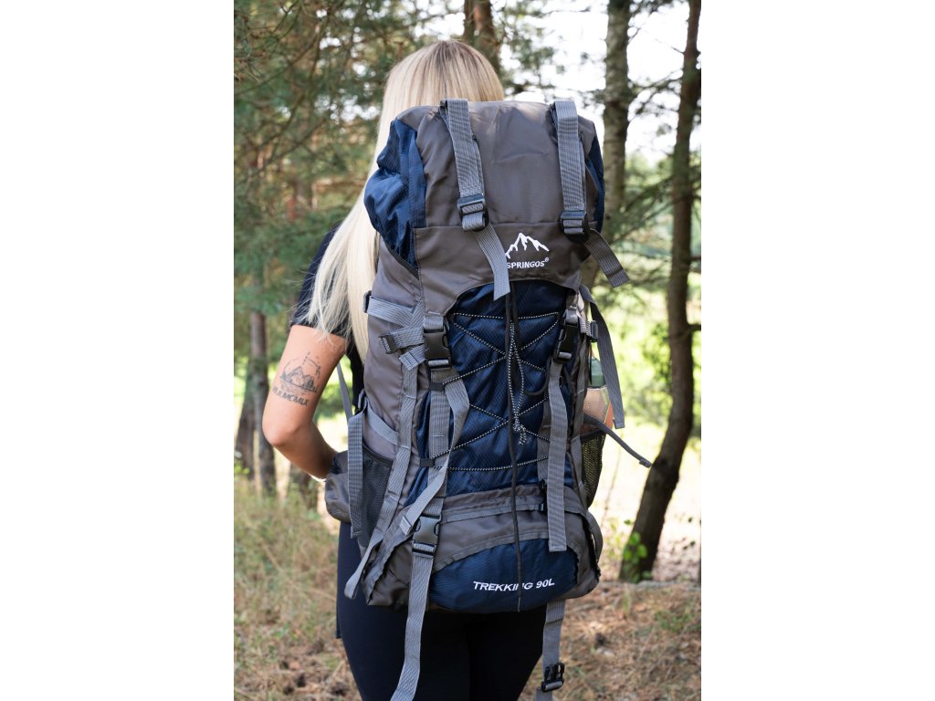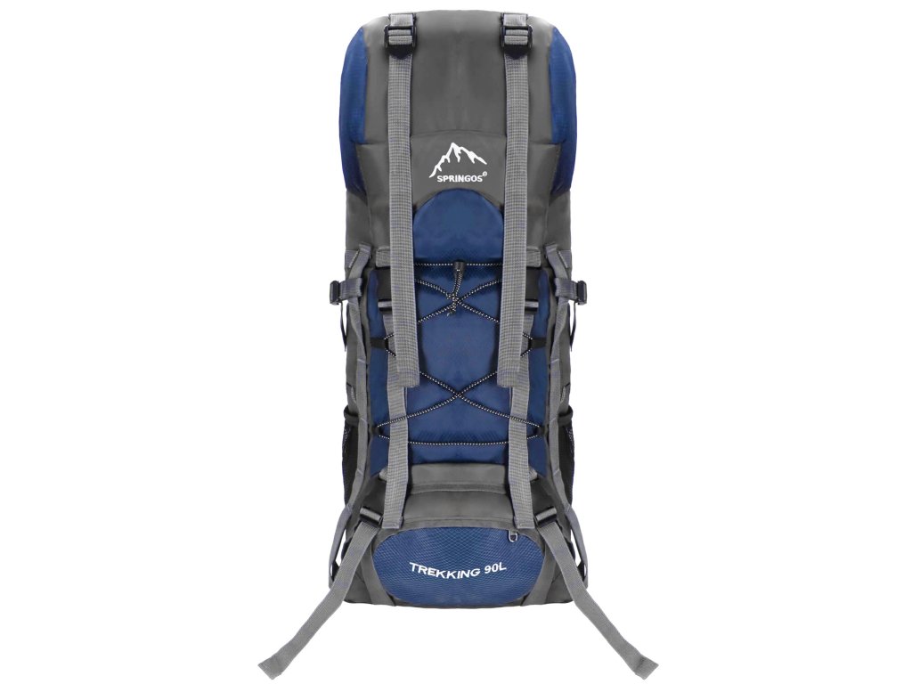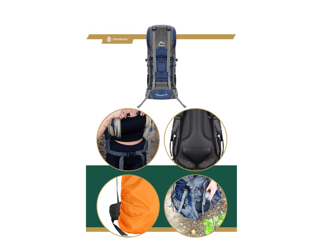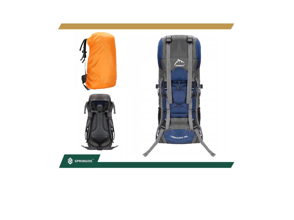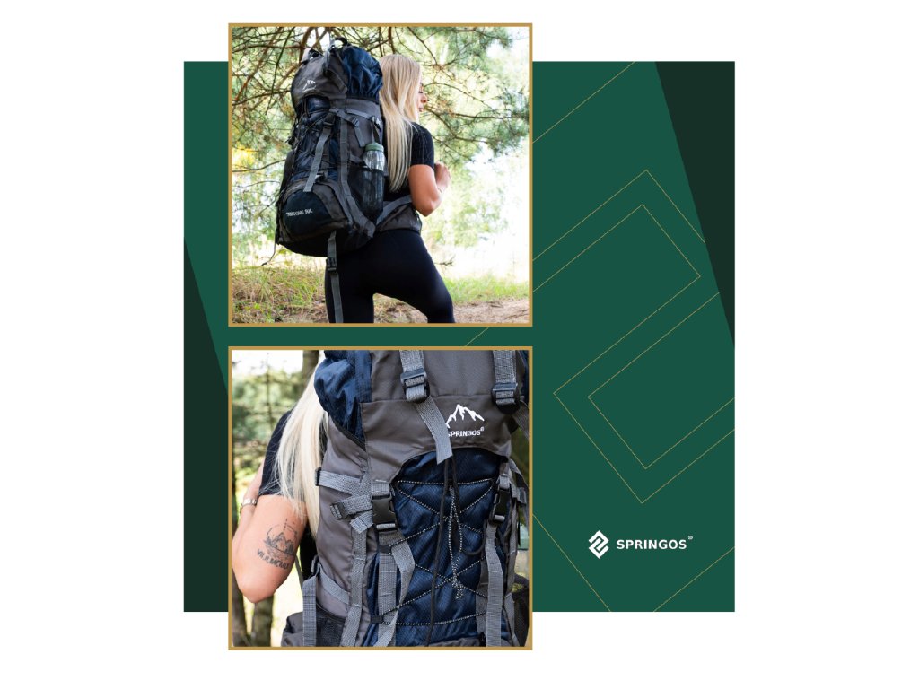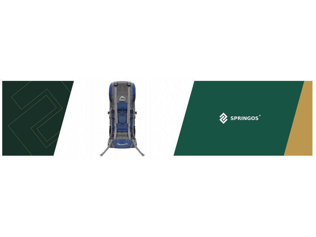 - În partea superioară din fața clapetei, logo brodat alb Springos, în partea de jos inscripția TREKKING 90L.
